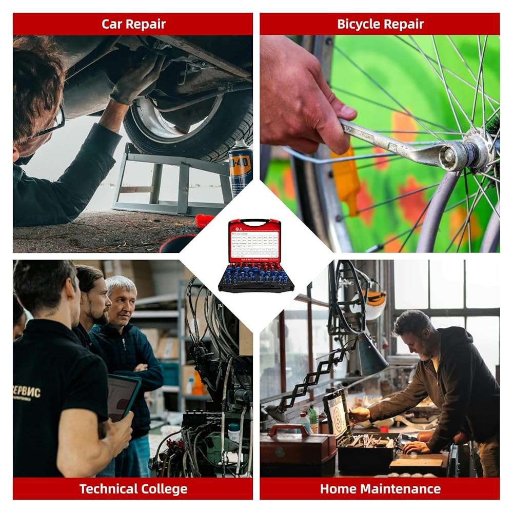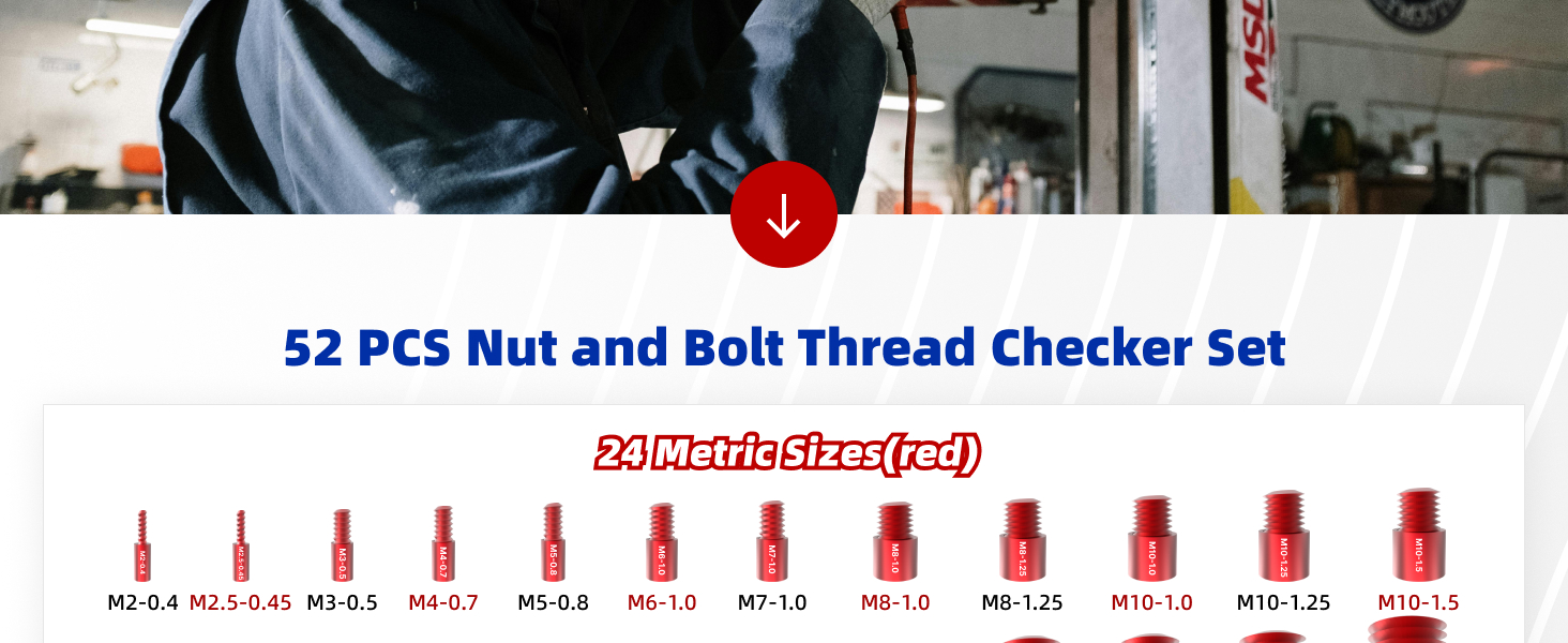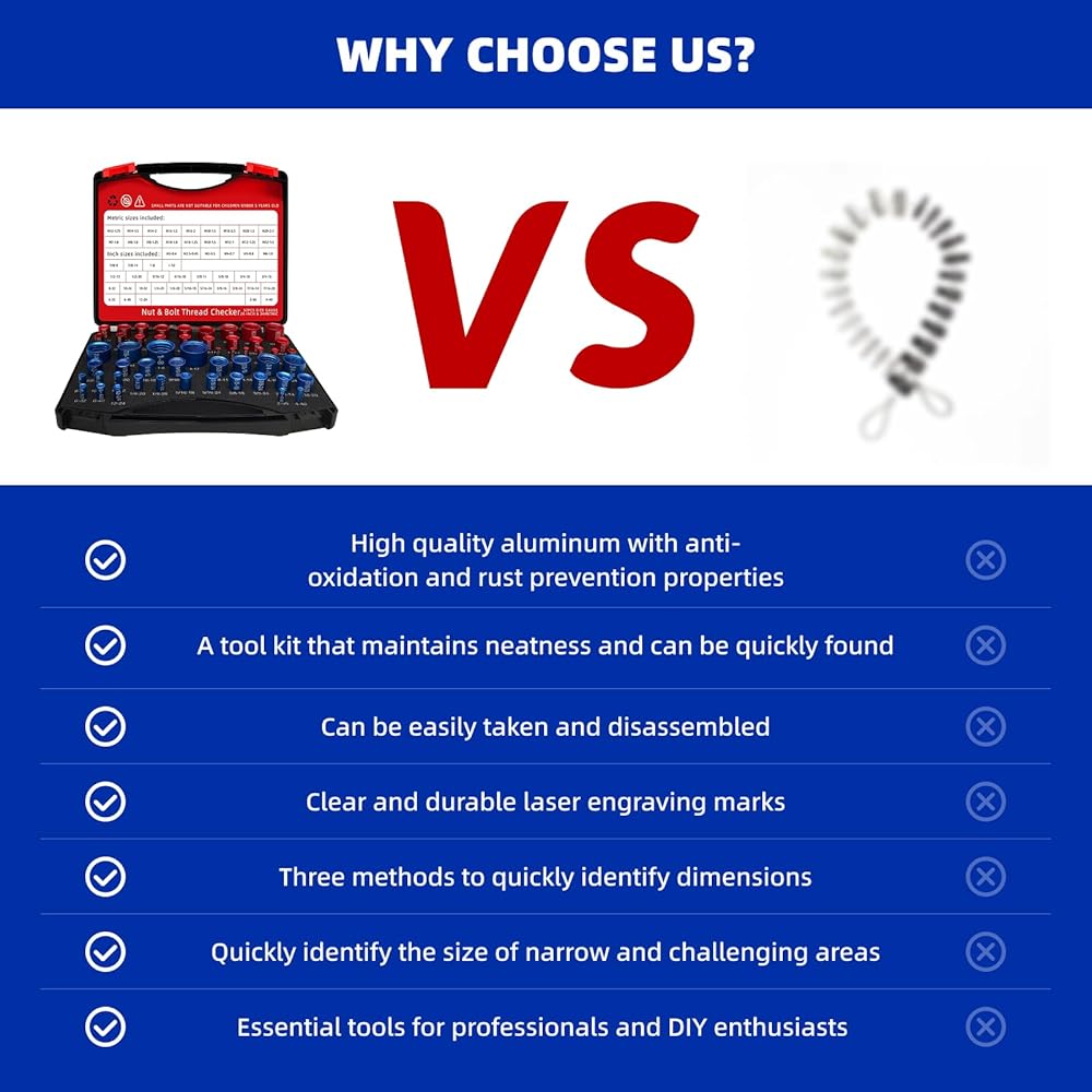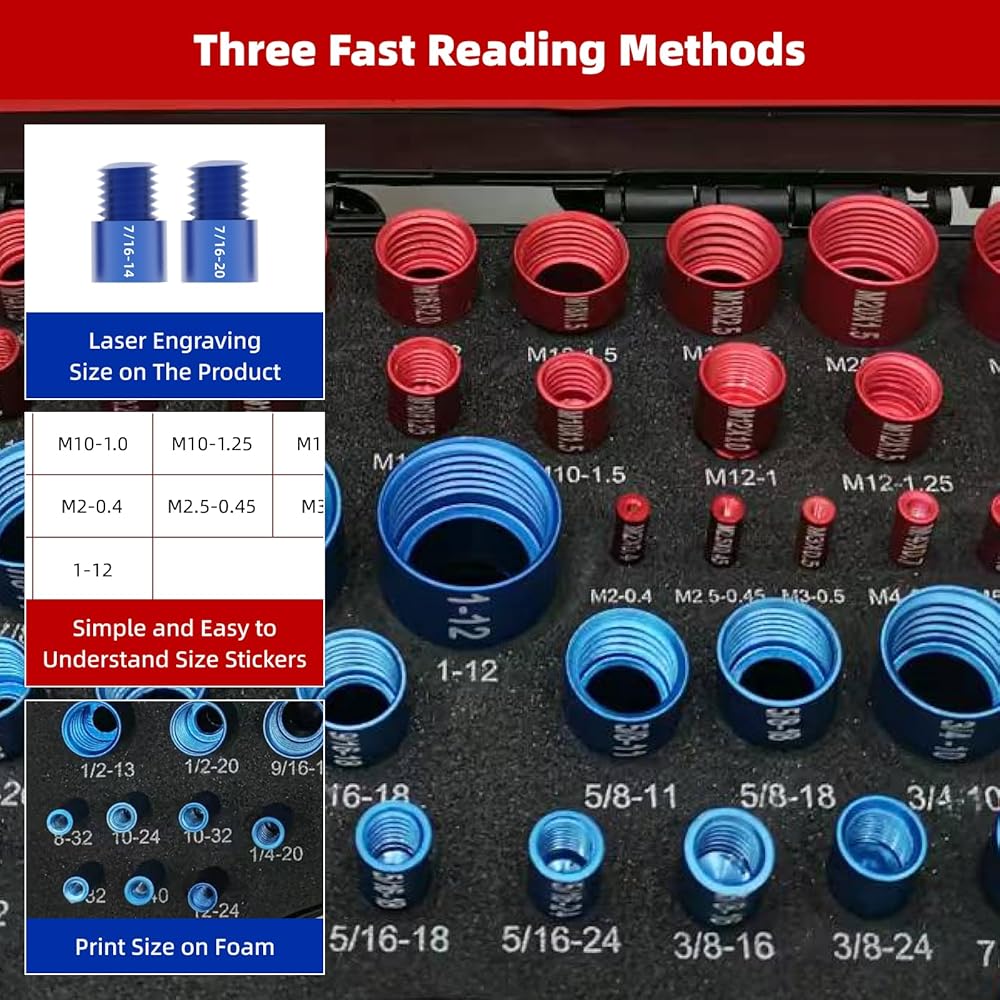 • 52 مفتش خيط يشمل: 28 بوصة و24 متريًا: أحجام بوصة (أزرق): 7/8-9، 7/8-14، 1-8، 1-12، 1/2-13، 1/2-20، 9/16-12، 9/16-18، 5/8-11، 5/8-18، 3/4-10، 3/4-16، 8-32، 10-24، 10-32، 1/4-20، 1/4-28، 5/16-18، 5/16-24، 3/8-16، 3/8-24، 7/16-14، 7/16-20، 6-32، 6-40، 12-24، 2-56، 4-40 الأبعاد المترية (الحمراء): M12-1.75، M14-1.5، M14-2، M16-1.5، M16-2، M18-1.5، M18-2.5، M20-1.5، M20-2.5، M7-1.0، M8-1.5، M10- 1.0 、 M10-1.25 、 M10-1.5 、 M12-1 、 M12-1.25 、 M12-1.5 、 M2-0.4 、 M2.5-0.45 、 M3-0.5 、 M4-0.7 、 M5-0.8 、 M6-1.0
