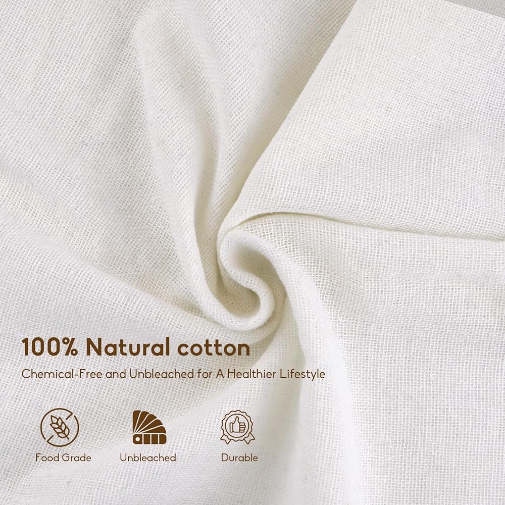 قطن طبيعي نقي 100% - مصنوع من القطن الطبيعي بنسبة 100%، قماشنا المجهد عديم الرائحة وخالي من الأصباغ. في حين أن القطن الطبيعي قد يحتوي على بقع صغيرة من القشرة، إلا أنه يمكن إزالتها بسهولة بعد الشطف الأول، مما يضمن بقاء نكهة طعامك نقية وغير ملوثة.