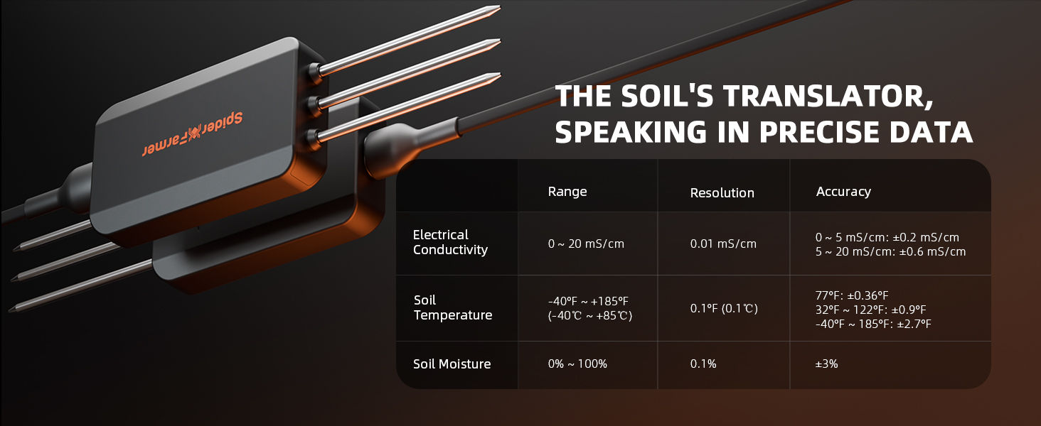 مستشعر التربة 3 في 1 عالي الدقة: يستخدم هذا المستشعر مجسات احترافية ورقائق عالية الجودة لقياس درجة حرارة التربة بدقة وسرعة (-40 درجة فهرنهايت ~ +185 درجة فهرنهايت، الدقة: 0.1 درجة فهرنهايت)، الرطوبة (0% ~ 100%، الدقة: 0.1%)، وEC (0 ~ 20 مللي ثانية/سم، الدقة: 0.01 مللي ثانية/سم). فهو يمكّن المزارعين من مراقبة الوسائط المتنامية بدقة وبشكل مستمر، مما يساعد على زيادة إمكانات نمو المحاصيل إلى أقصى حد.