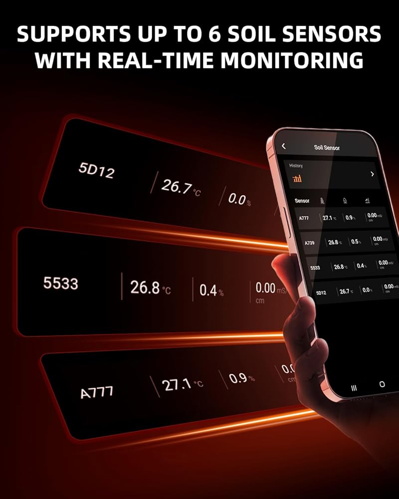 مراقبة وتصور الرسوم البيانية في الوقت الفعلي: بمجرد توصيله عبر كابل RJ12 بوحدة تحكم GGS أو شريط الطاقة GGS، يمكنك استخدام تطبيق Spider Farmer المجاني لمراقبة بيانات التربة في الوقت الفعلي على هاتفك وتحليل الاتجاهات التاريخية عن طريق تخصيص نطاقات التاريخ.