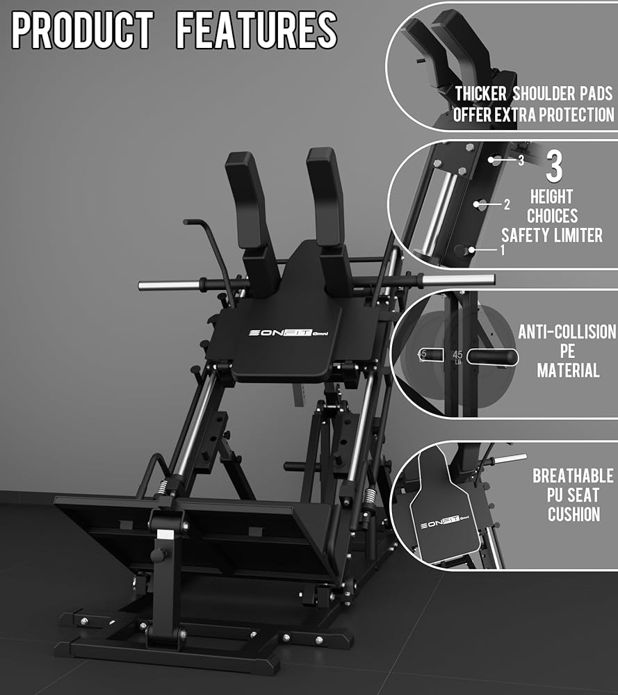 راحة ومتانة معززة - وسادة الكتف ومسند الظهر السميكة مغلفة بجلد فاخر مضاد للانزلاق، وتوفر راحة طويلة الأمد لتخفيف الضغط والإجهاد مع حماية العظام والمفاصل أثناء جلسات كمال الأجسام. تضمن قضبان التوجيه المعدنية الصلبة والمحمل المتميز حركات تمرين سلسة دون هزات، مما يعزز تجربة التمرين بشكل عام.