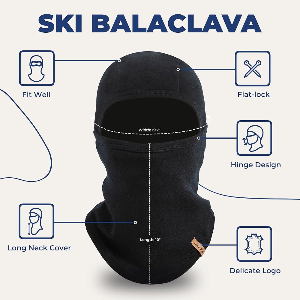 صُنعت لتناسب الجميع - مقاس واحد يناسب الجميع. يوفر الهيكل المحبوك امتدادًا كبيرًا ليناسب معظم أحجام الرأس بسهولة. قطع يعانق الوجه وخياطة ذات قفل مسطح يجعل قناع الوجه من صوف ميرينو مناسبًا بشكل جيد مع عدم وجود نتوءات غريبة، مما يضمن عدم الراحة كبطانة خوذة.