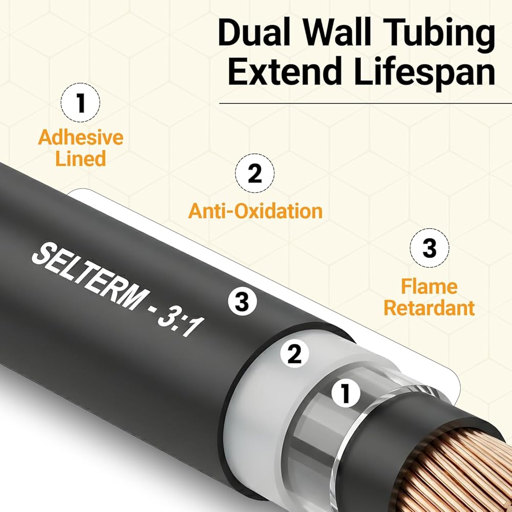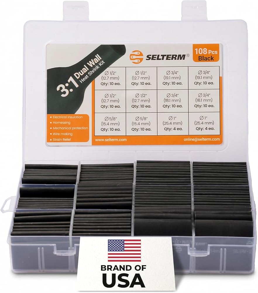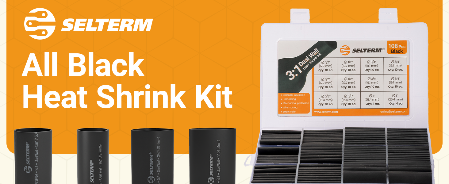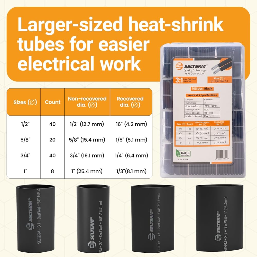 طقم أنابيب انكماش حراري من الدرجة البحرية كبيرة الحجم من SELTERM، تشكيلة 1، 3/4، 1/2، 5/8 بوصة، بطانة لاصقة مزدوجة الجدار 3:1، لموصلات أطراف كابل البطارية - أسود [108 قطعة]