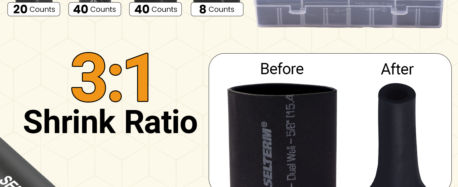 • حجم مثالي وجاهز للاستخدام: تم تنظيم مجموعة موصلات الانكماش الحراري الخاصة بنا ومعبأة في حزمة أنيقة وسهلة الاستخدام مع مواصفات مفصلة للحجم على موصلات المؤخرة المنكمشة بالحرارة التي تساعدك على تخزين واختيار الأحجام الصحيحة لاتصالاتك.