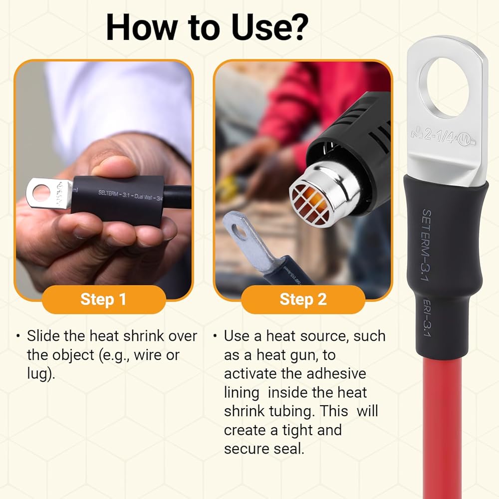 • كيفية الاستخدام: خطوتين سهلتين لإغلاق التوصيلات. 1. قم بتمرير أنبوب الانكماش الحراري اللاصق المطلوب فوق نقطة الاتصال الخاصة بك وفقًا لمواصفات الحجم. 2. استخدم مسدسًا حراريًا أو منفاخ هواء ساخن لإغلاق الاتصال. هذا كل شيء! استمتع براحة البال التي تأتي مع ختم لاصق آمن ومحكم.