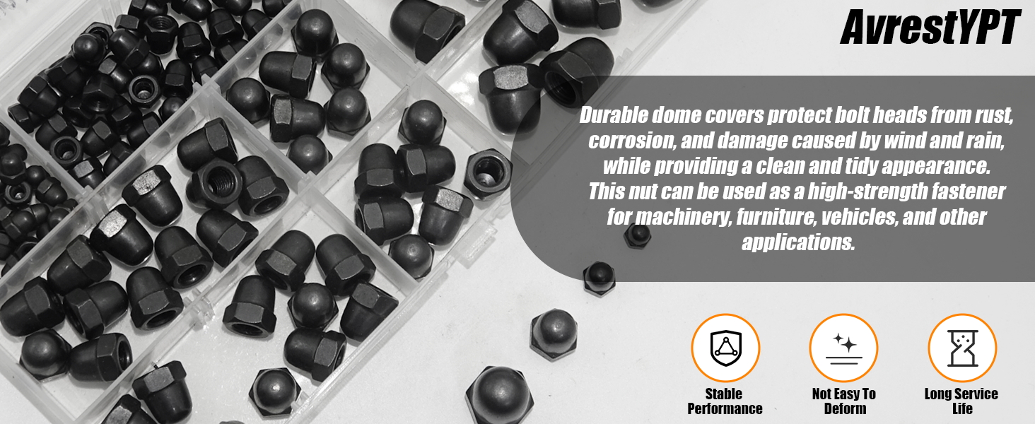 • تصميم قبة سداسية للحصول على لمسة نهائية احترافية، غطاء مزخرف على شكل بلوط يخفي خيوط الترباس المكشوفة مع توفير مظهر نظيف ومصقول؛ قاعدة سداسية تضمن التثبيت الآمن باستخدام مفاتيح ربط قياسية؛ مثالية للمثبتات المرئية على الأثاث والدراجات النارية والآلات والبنيات المخصصة