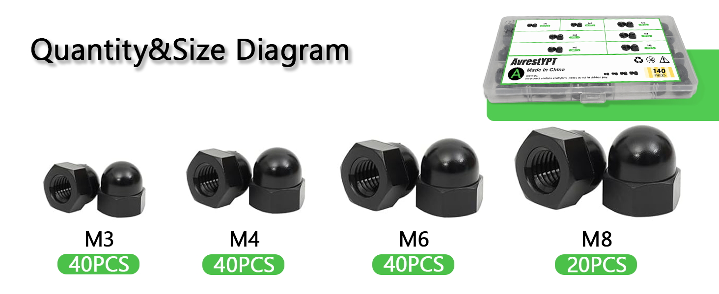 • مجموعة متنوعة من الأجهزة الكاملة مجموعة احترافية مكونة من 140 قطعة تتضمن M3 (40 قطعة)، M4 (40 قطعة)، M6 (40 قطعة)، وM8 (20 قطعة) صواميل غطاء البلوط في حقيبة تخزين مريحة؛ يلغي الرحلات المتعددة إلى متجر الأجهزة ويضمن حصولك دائمًا على الحجم المناسب لأي مشروع