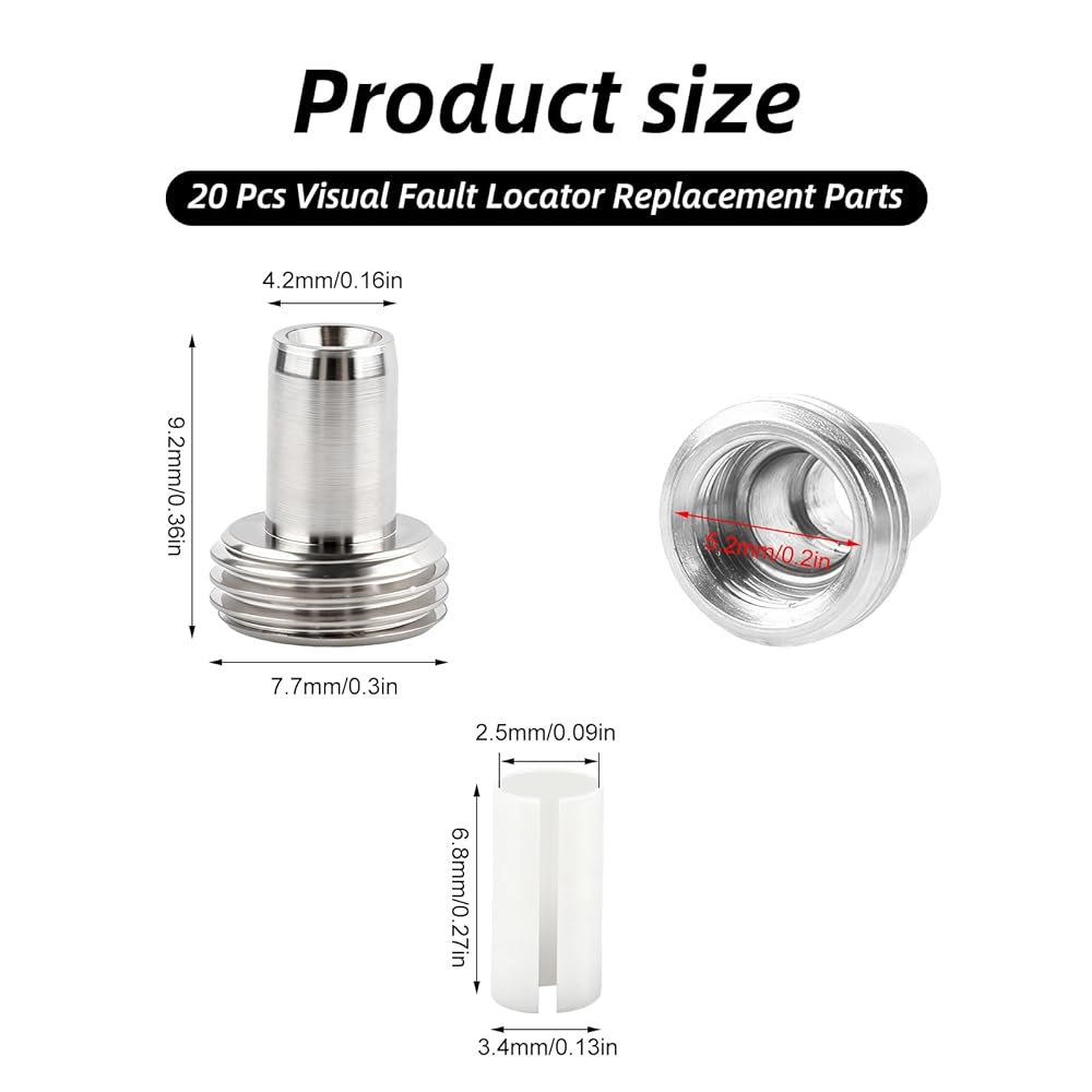 Product Contents: 20 pieces of replacement parts with 10 fiber optic ceramic core sleeves and 10 metal head connectors, standard size for universal fit with most visual fault locators and fiber optic test equipment.