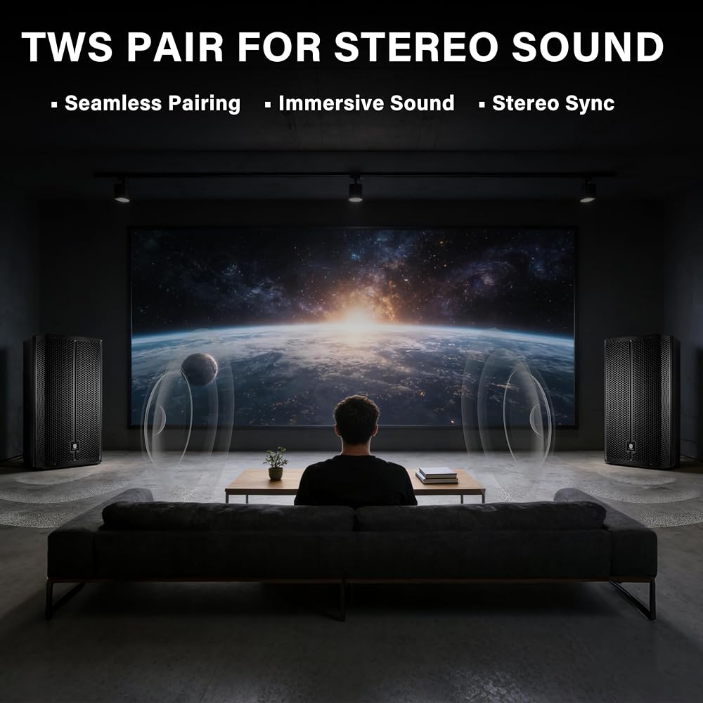 Bluetooth & TWS Stereo Pairing: Enables wireless audio streaming via Bluetooth. Unique TWS technology allows wireless pairing of two speakers to create an immersive stereo sound system, instantly doubling your audio presence.