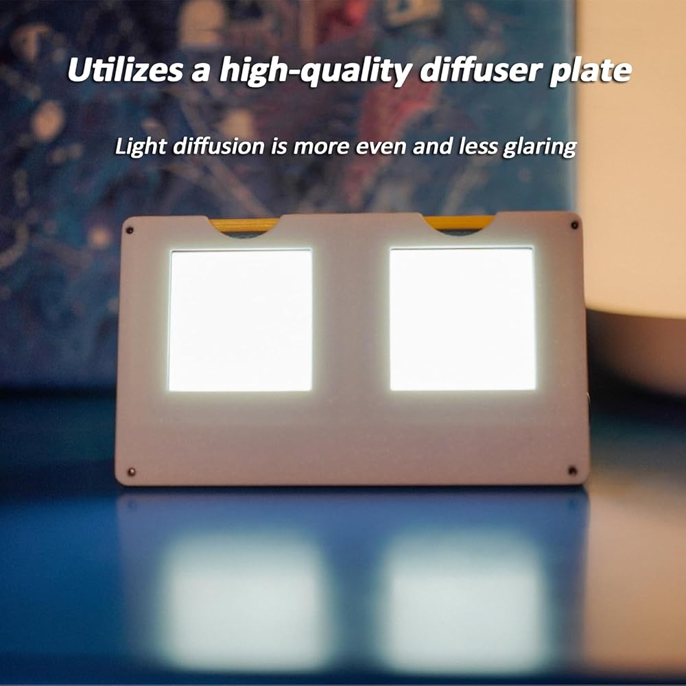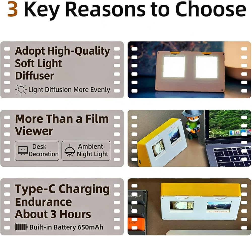 【Rechargeable Design】: Utilizing a high-quality soft light diffuser, the light is more evenly diffused and not glaring. It features Type-C charging, a built-in 650mAh battery, and approximately 3 hours of battery life, making it a great night light for displaying reversal films.