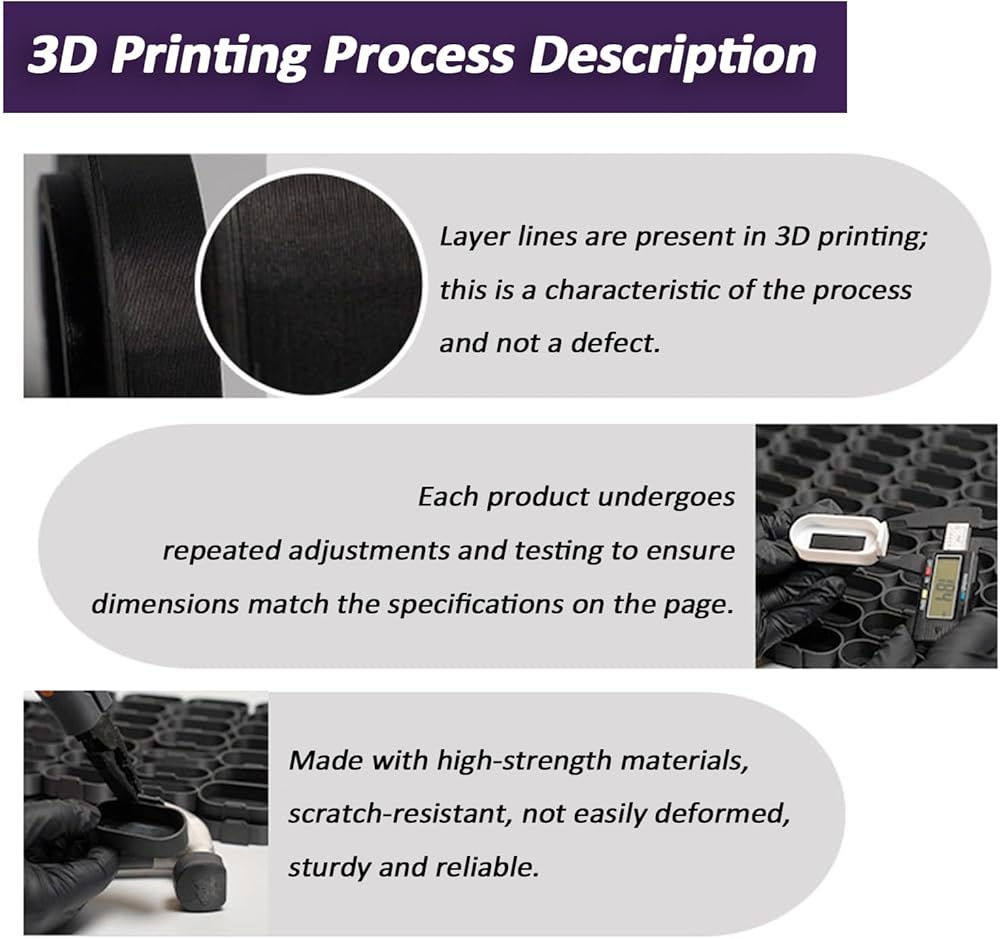 【3D Printing Process Explanation】: Layer textures are inherent to 3D printing and are not defects. Each product undergoes repeated adjustments and testing to ensure dimensions match the specifications on the page. High-strength materials are used, making them scratch-resistant, deformation-resistant, sturdy, and reliable.