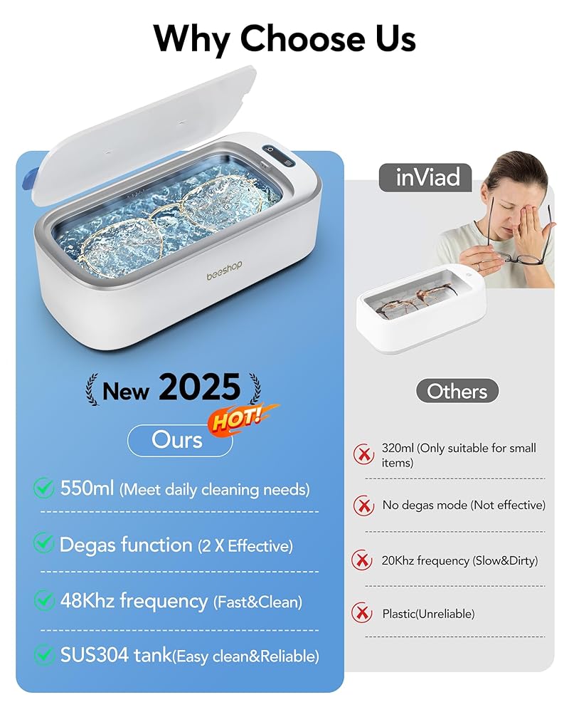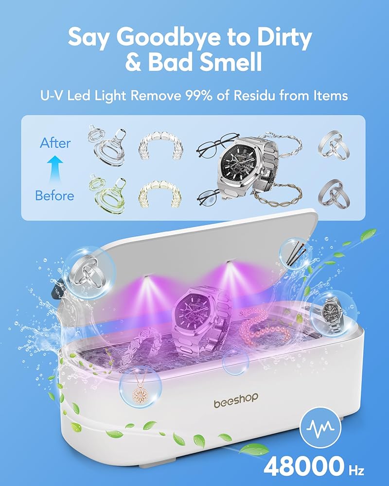 【منظف المجوهرات بالموجات فوق الصوتية 48 كيلو هرتز مع مصابيح LED مزدوجة】 يستخدم منظف المجوهرات هذا موجات فوق صوتية عالية التردد 48 كيلو هرتز جنبًا إلى جنب مع مصابيح LED مزدوجة لتوفير تنظيف عميق بزاوية 360 درجة، مما يساعد على استعادة لمعان أغراضك. تعمل مصابيح LED على تحسين الرؤية وتساعد على إزالة الأوساخ من المناطق التي يصعب رؤيتها. (ملاحظة: لا يُنصح باستخدامه مع النظارات ذات الطلاء بالأشعة فوق البنفسجية أو المجوهرات الرقيقة مثل اللؤلؤ أو الأوبال أو البيريل أو الفيروز أو المرجان.)