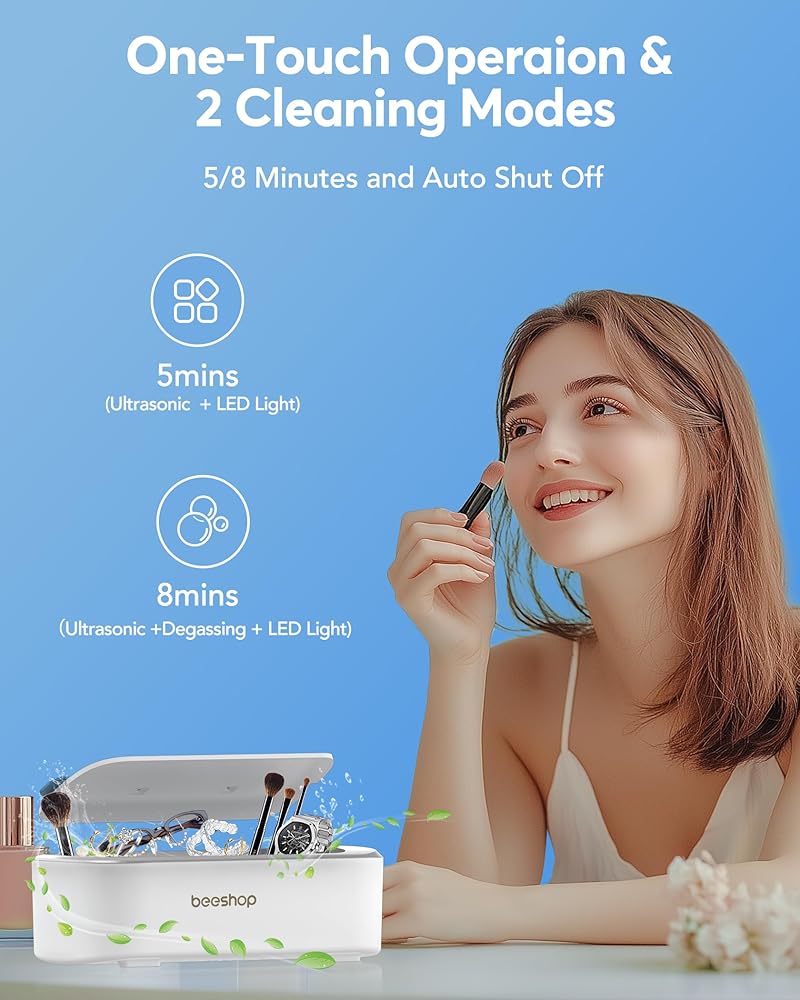 【وضعان للتنظيف】يوفر وضعين للتنظيف: 5 دقائق (الموجات فوق الصوتية + ضوء LED) و8 دقائق (الموجات فوق الصوتية + ضوء LED + وظيفة إزالة الغاز). يمكنك تحديد الوضع بناءً على حالة العناصر. بالنسبة للبقع العنيدة، يمكن استخدام أقراص التنظيف (غير متضمنة) والدورات المتكررة لتحسين النتائج.