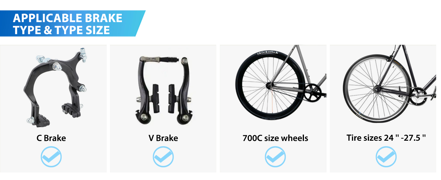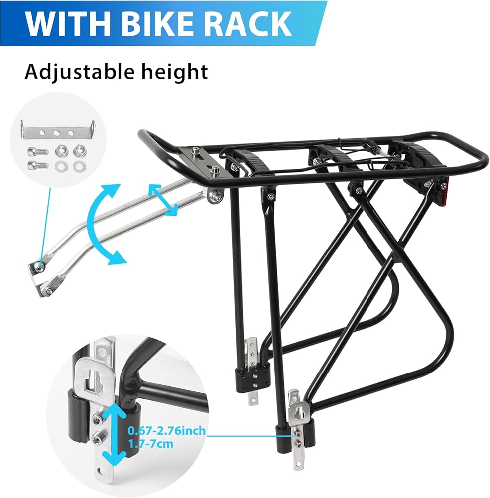 ارتفاع قابل للتعديل والتوافق: رف خلفي للدراجة مع ارتفاع قابل للتعديل يناسب عجلات 24 بوصة - 27.5 بوصة و700C متوافقة مع فرامل C وفرامل V ولكن ليس لفرامل الأقراص القابلة للطي أو إطارات الدهون أو دراجات الأطفال