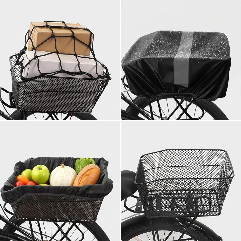 غطاء مقاوم للماء ومجموعة عاكسة: تتضمن سلة الدراجة الخلفية غطاء مقاوم للماء وبطانة شبكة كارجو ولوحة عاكسة لحماية معداتك من المطر وتحسين السلامة الليلية، مثالية للتنقل في المدينة ورحلات التخييم