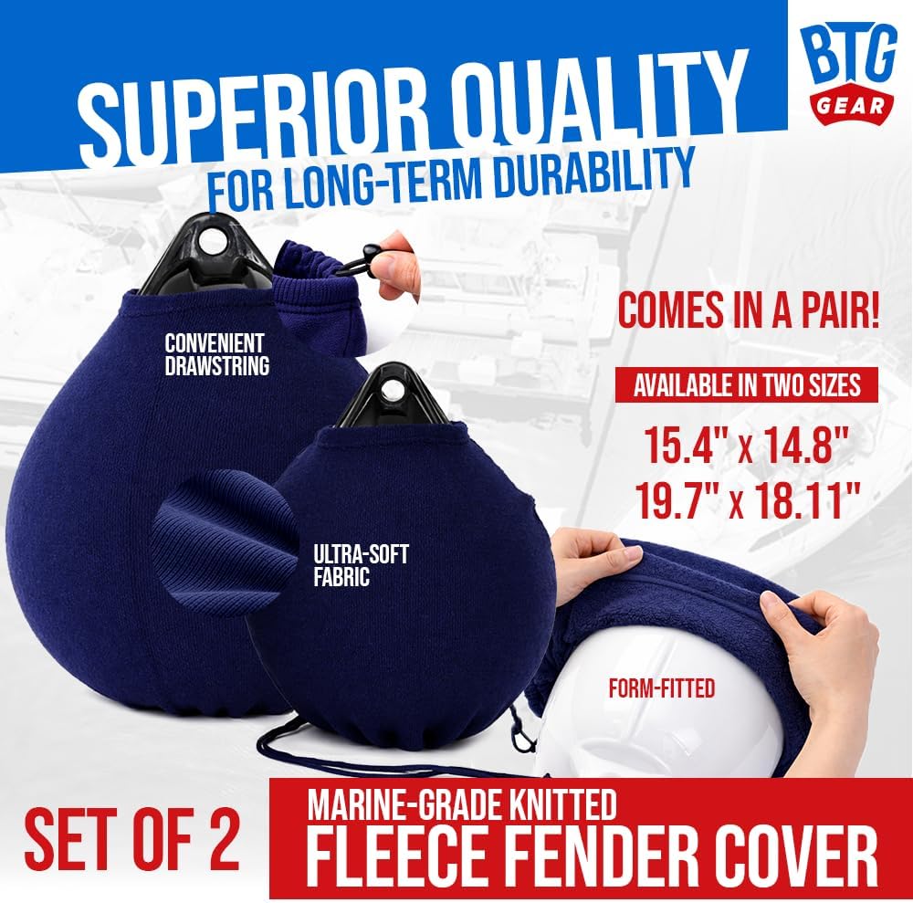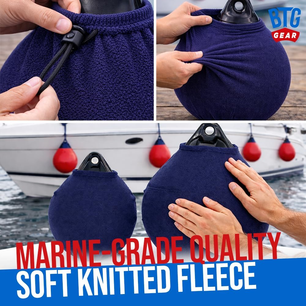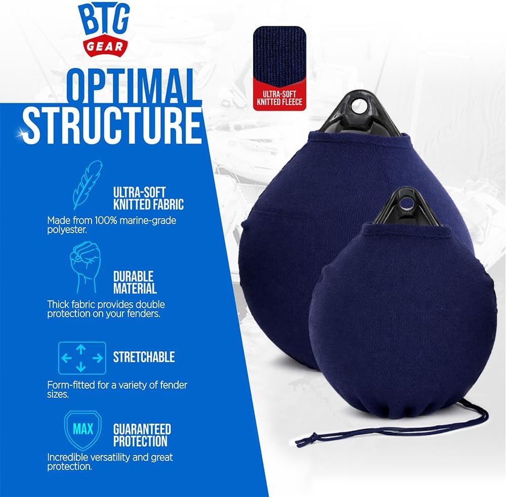Introducing our BTG Gear navy blue fender covers designed specifically for Mooriong Buoy Bumpers. Crafted from super soft knitted marine-grade polyester, these covers provide exceptional protection for both your hull and fenders. Each bumper cover is equipped with a convenient drawstring, ensuring a smooth and snug fit that enhances the appearance of your fenders. No more loose or sagging covers! Say goodbye to annoying fender squeaks during docking. Our fender covers are designed to minimize noise, allowing you to enjoy a peaceful boating experience. Not only do these covers safeguard your fenders, but they also provide essential protection for your boat's hull. Shielding it from scuffs caused by fenders, they help maintain its pristine condition. Additionally, our fender covers offer defense against damaging UV rays and the elements, extending the lifespan of your fenders.