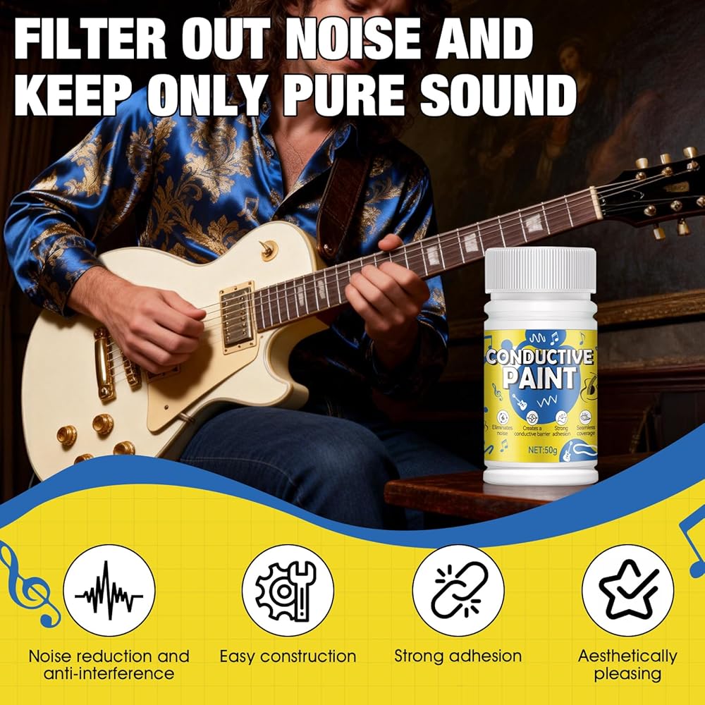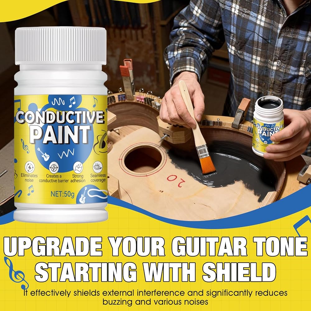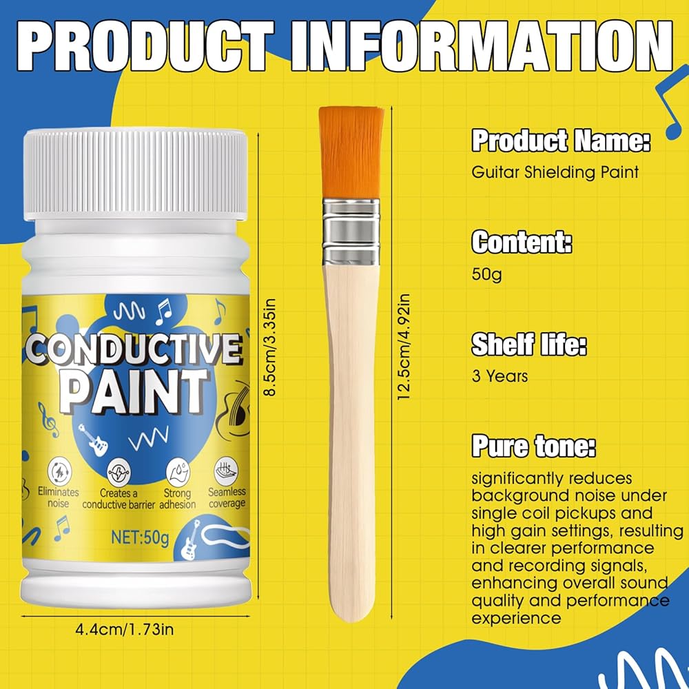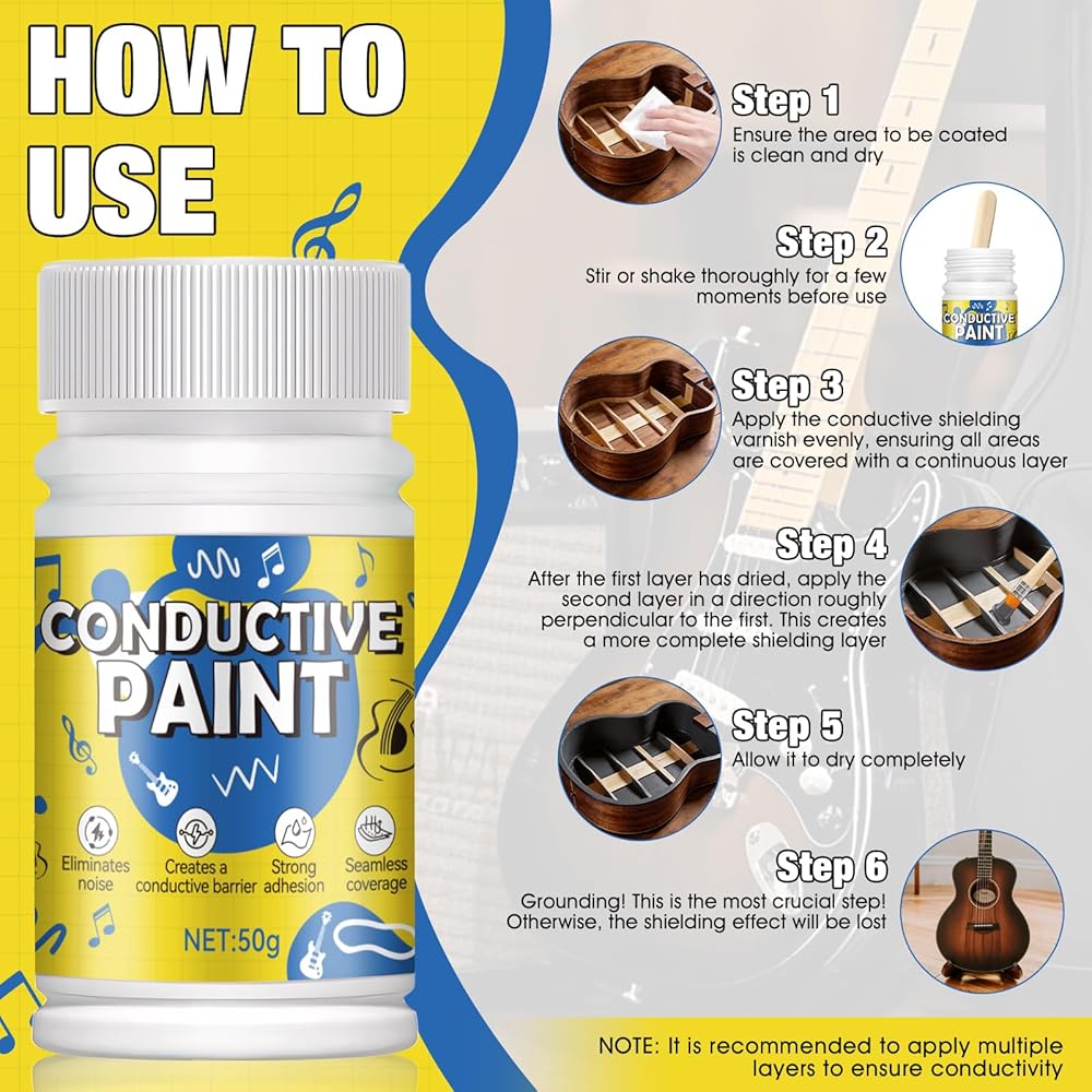 MULTIPURPOSE CONDUCTIVE SOLUTION FOR ELECTRONICS: Beyond guitar paint, this conductive coating is perfect for electronic circuit printing, repairing conductive traces, and electronic prototyping. It serves as an excellent alternative to copper conductive paint and conductive glue, providing a durable, long-lasting shield that won't affect pickup.