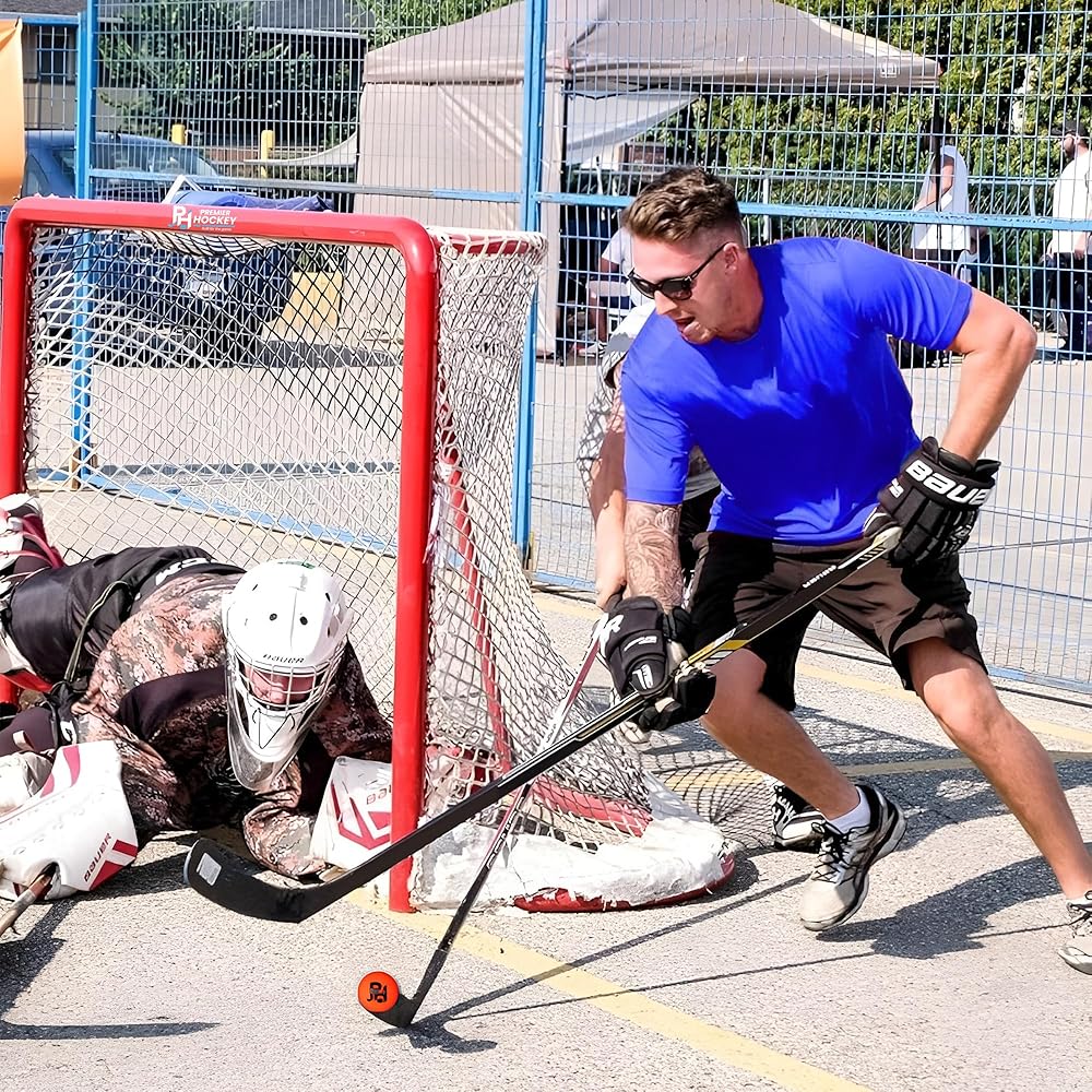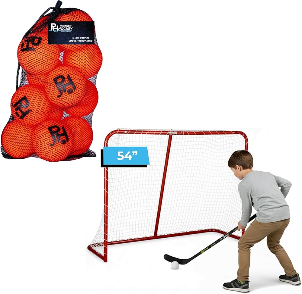 ✅ ALL IN ONE: Street Hockey Goal & Balls Set – bundle features a durable steel street hockey goal for long-lasting performance + 12 official 2 5/8” low-bounce street hockey balls in a reusable mesh bag, perfect for family fun or team play. Ideal for street and roller hockey anywhere.