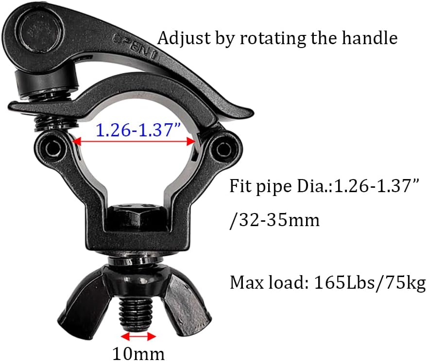 Quick install or remove, adjusting by rotating the handle. Suitable for for DJ stage light, par light, moving head light, spotlight., etc