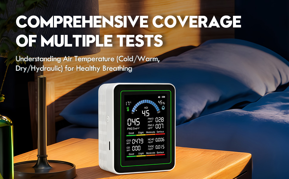 • توفر شاشة جودة الهواء 10 في 1 مراقبة دقيقة للغاية لمختلف الملوثات، بما في ذلك ثاني أكسيد الكربون، وHCHO، وTVOC، وPM2.5، وPM10، وCO، وAQI، مع هامش خطأ أقل من 5%، وتوفر تقارير جودة الهواء للمنازل والمكاتب والمدارس وغيرها من الإعدادات، مما يضمن تنفسًا خاليًا من القلق.