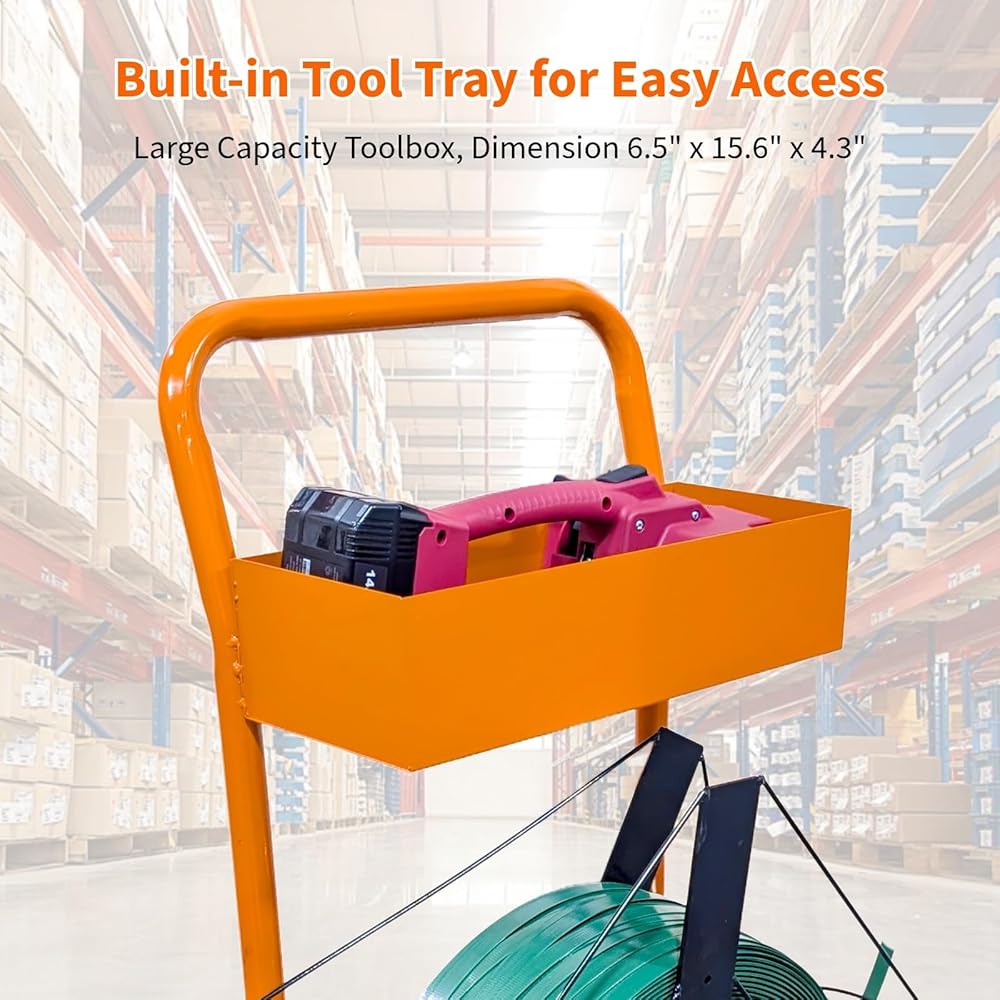 【Mobile Work Station with Tool Tray】Equipped with large, wear-resistant rubber wheels for easy maneuvering across concrete warehouse floors. Includes a spacious built-in tool tray to conveniently store your tensioners, sealers, seals, and cutters, keeping your packaging workspace organized and efficient.