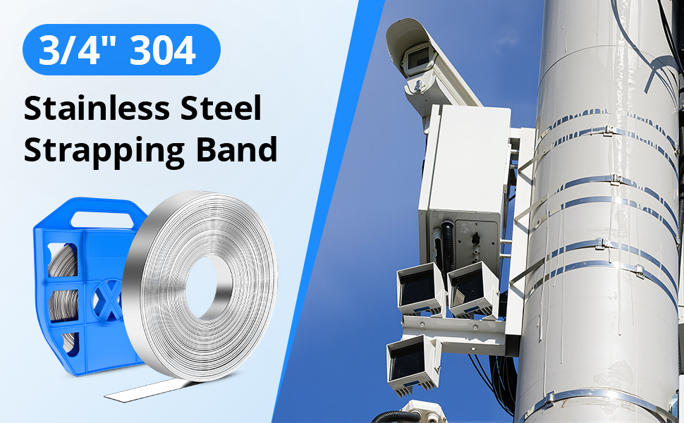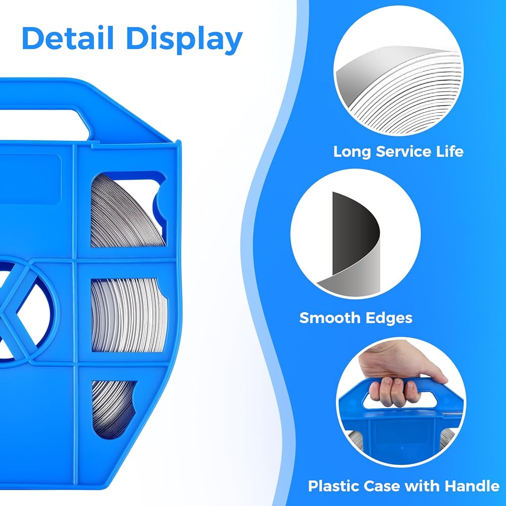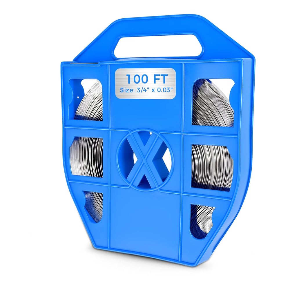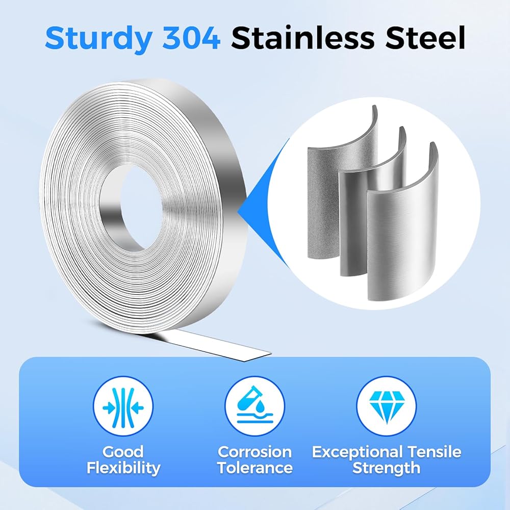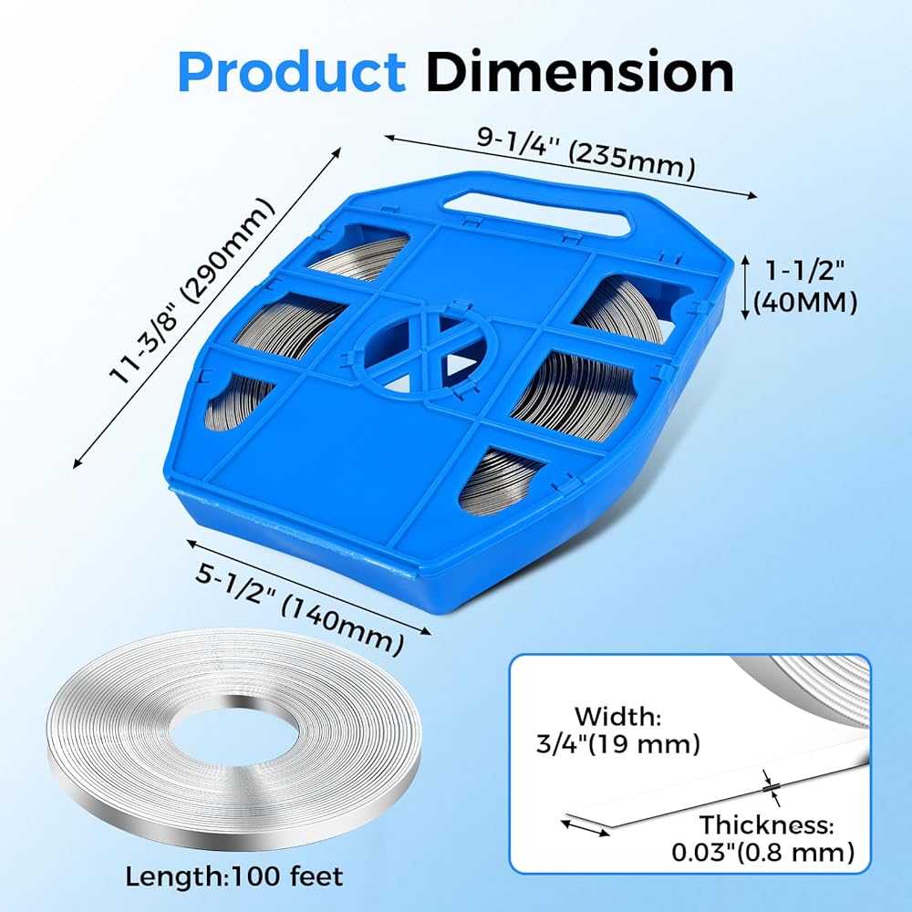 المواصفات: الطول: 100 قدم (30 مترًا)، العرض: 3/4 بوصة (19 ملم)، السُمك: 0.03 بوصة (0.8 ملم). تشمل العبوة: 1 × ملف حزام من الفولاذ المقاوم للصدأ، 1 × علبة بلاستيكية.