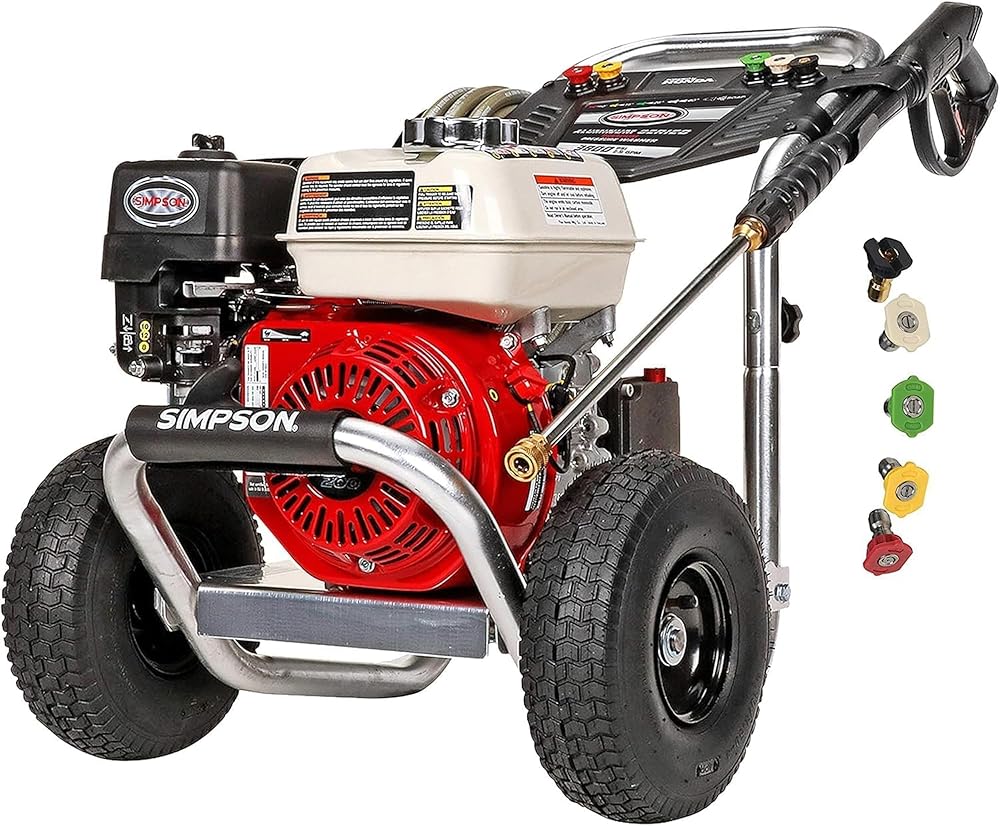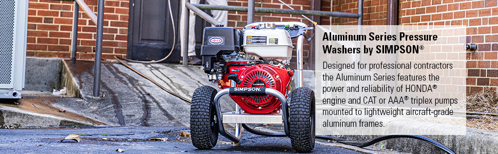 The SIMPSON Aluminum Series pressure washer 4200 PSI at 4.0 GPM is great for construction, equipment upkeep, and facility and fleet maintenance cleaning. With a powerful HONDA GX390 engine, reliable CAT triplex pump, and ultra lightweight aircraft grade aluminum frame, this pressure washer is the optimum blend of maneuverability and performance. The ALH4240 also comes with a 50' hose, ergonomic spray gun, and 5 Quick Connect nozzles. Designed to meet the rigorous demands of the cleaning professional, the SIMPSON Aluminum Series frame is crafted of 100% aircraft grade aluminum, making it lighter in weight than most steel frame pressure washer designs. Perfect for contractors who specialize in deck cleaning, wood restoration, paint preparation, graffiti removal and all other professional cleaning services. The SIMPSON Aluminum Series designed for optimum performance in the harshest environments. Easy-to-assemble and easy-to-start, the Aluminum Series power washer is great for contractors who specialize in deck cleaning, wood restoration, and all professional services. 10 Year Limited Frame Warranty, 5 Year Limited Pump Warranty, 3 Year Limited Engine Warranty. Includes: Pressure Washer, Hose, Gun, Wand, 5 Quick connect nozzle tips, Detergent siphon tube with filter, Engine Oil, Quick start set up guide, Owner's manual.