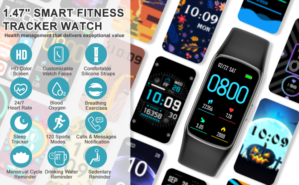 شاشة لمس كاملة ملونة فائقة الدقة مقاس 1.47 بوصة: جهاز تتبع اللياقة البدنية مع شاشة AMOLED HD ملونة تعمل باللمس بتصميم منحني، وشاشة بصرية رائعة، توفر لك تجربة لمس وبصرية عالية الجودة. يوجد أكثر من 200+ خيار لوجه الساعة يمكنك الاختيار من بينها في التطبيق. يمكنك أيضًا تخصيص وجه الساعة الذكية بصور من الألبوم الخاص بك. لذلك من السهل العثور على المظهر المناسب في اللحظة المناسبة