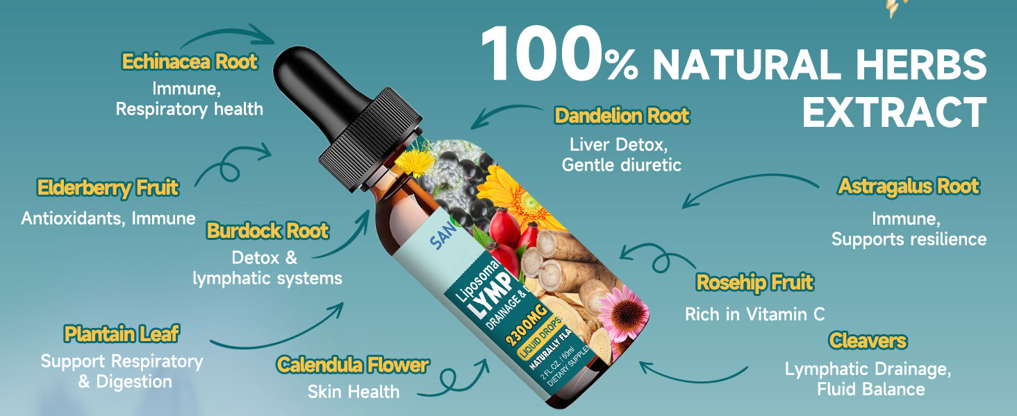 مزيج عشبي 9 في 1: تركيبة قطرات التصريف اللمفاوي SANISCE مستخرجة من 9 أعشاب طبيعية مع إشنسا بوربوريا، البلسان، استراغالوس، الهندباء، أعشاب السواطير، الأرقطيون، ثمر الورد، زهرة الآذريون، وأوراق لسان الحمل في تركيبة واحدة مناسبة لتوفير دعم شامل لنظامك الليمفاوي. تركيبة نباتية نظيفة مصممة للجهاز اللمفاوي وتساهم في الصحة العامة