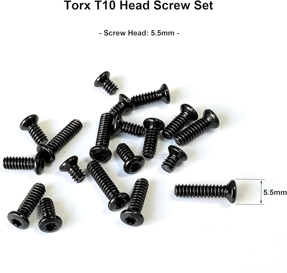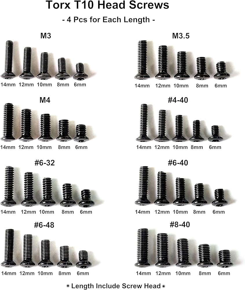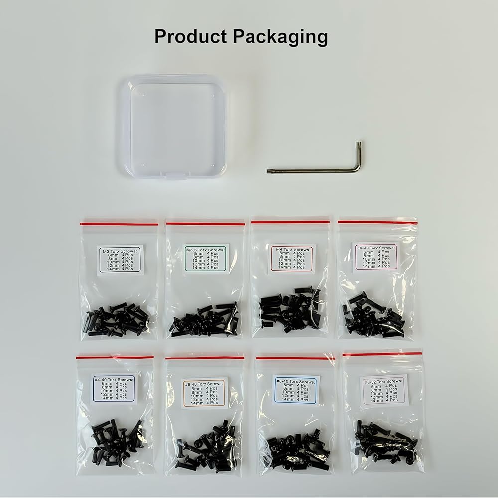 - 8 أنواع من براغي توركس، 5 أطوال لكل نوع، 4 قطع براغي من كل طول، مفتاح T10 توركس متضمن.