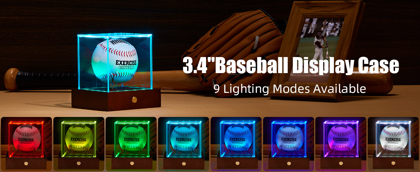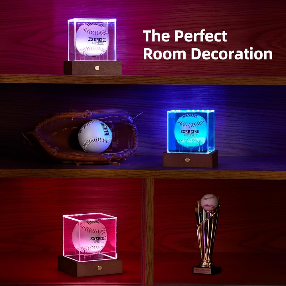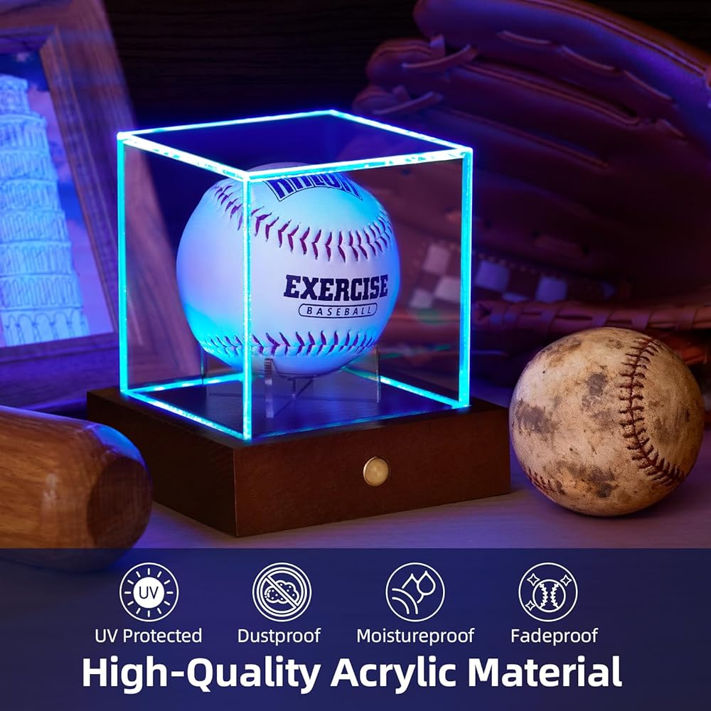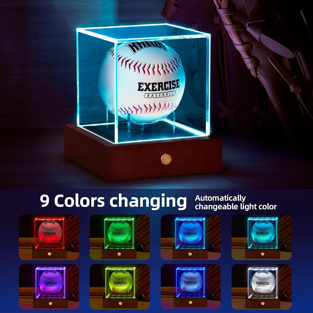 حافظة عرض البيسبول LED من HouseJoy: حامل كرة مكعب أكريليك مع ضوء 9 ألوان، صندوق عرض بقاعدة خشبية، مكعب شفاف محمي من الأشعة فوق البنفسجية لهدايا البيسبول التذكارية
