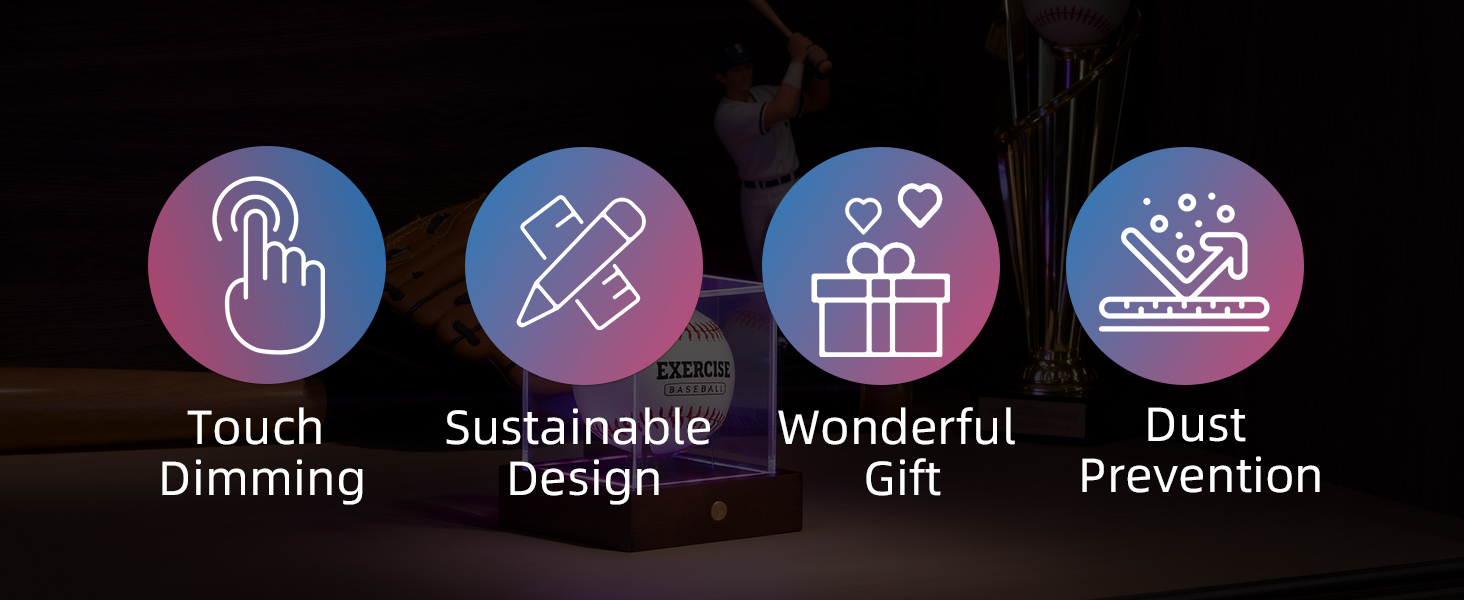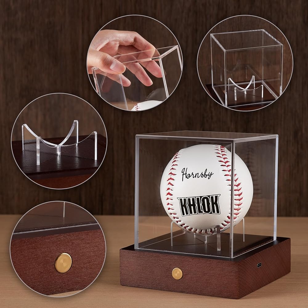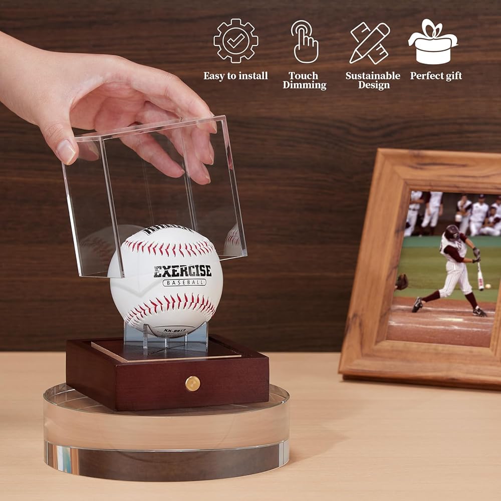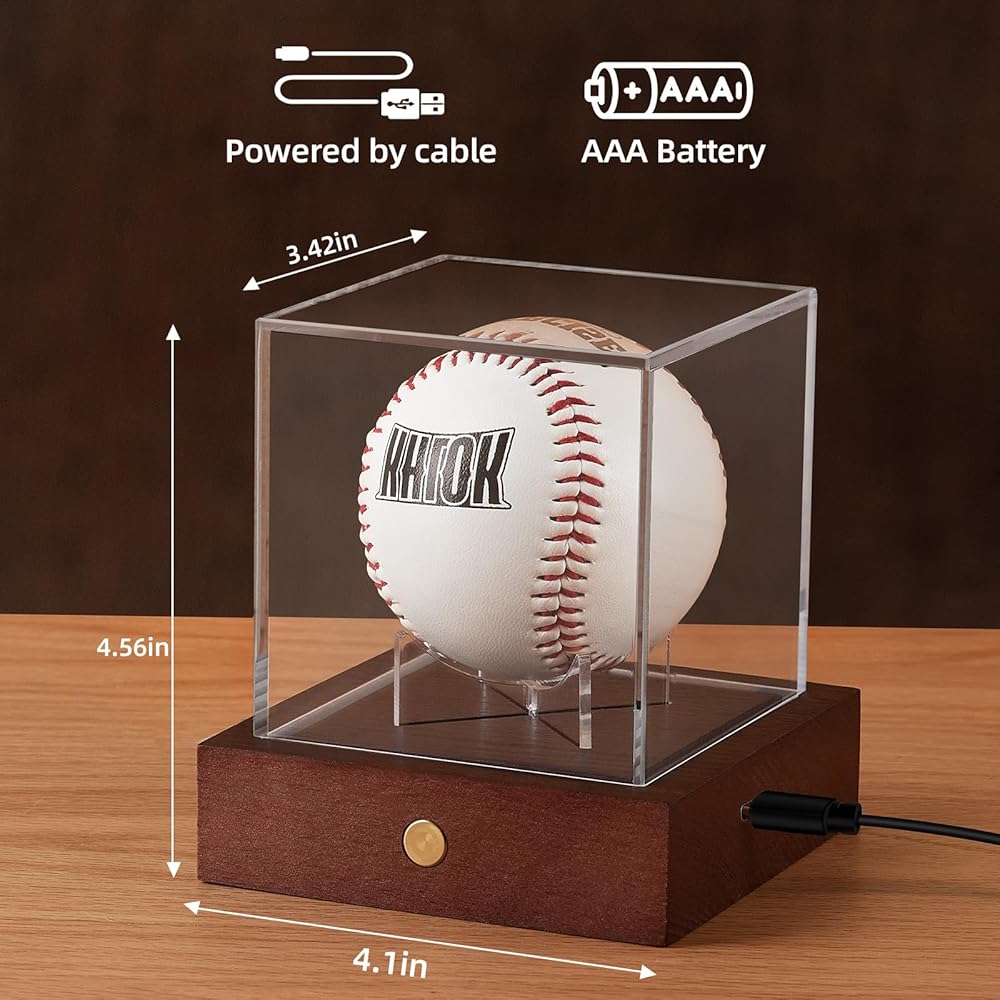 حافظة عرض البيسبول LED من HouseJoy: حامل كرة مكعب أكريليك مع ضوء 9 ألوان، صندوق عرض بقاعدة خشبية، مكعب شفاف محمي من الأشعة فوق البنفسجية لهدايا البيسبول التذكارية