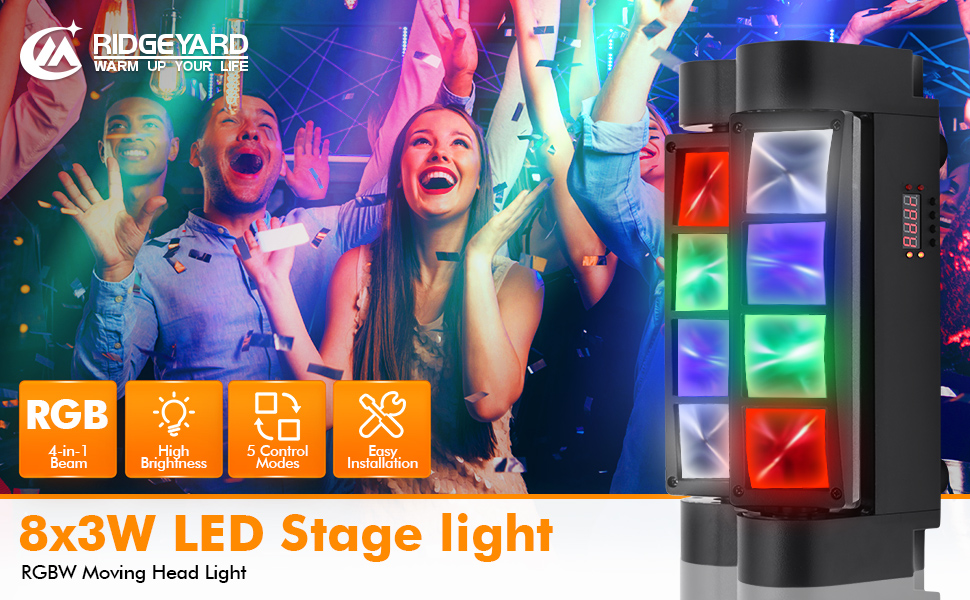 ضوء قوي: 8 خرزات ضوئية قوية مع RGBW 4 في 1 باللون الأحمر والأخضر والأزرق والأبيض، يمكن تغيير اللون ودمجه بحرية للحصول على تأثيرات بصرية رائعة. يمكن أن يعمل ضوء المسرح بشكل جيد مع مكبرات الصوت ويتزامن معًا لإنشاء عروض ضوئية رائعة.