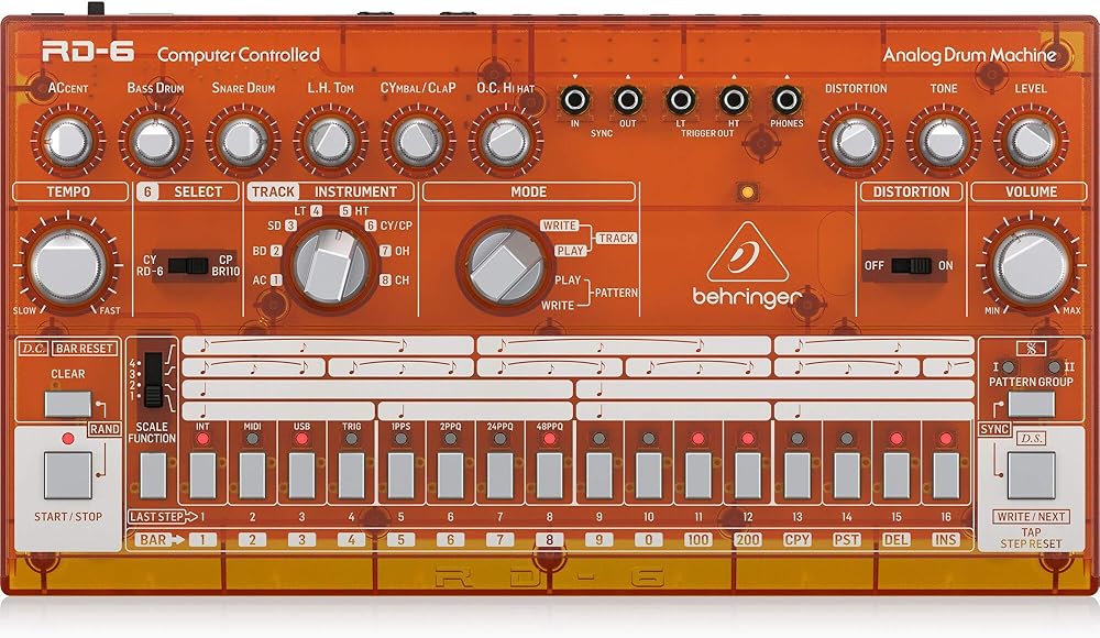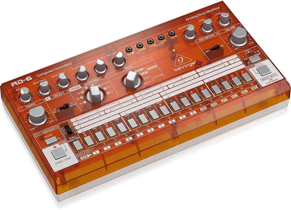 Classic Analog Drum Sounds for Modern Producers Loaded with eight analog drum voices derived from the classic 606 drum machine, the Behringer RD-6 analog drum machine combines iconic '80s drum machine sounds with modern USB and MIDI connectivity. Use the 16-step drum sequencer to create your grooves, with seamless real-time switching between up to 32 patterns. For longer sequences, you can chain patterns into full songs with up to 250 bars. And with trigger outputs to control your other modular and semi-modular synthesizers, the Behringer RD-6 is the perfect way to bring old-school analog drum sounds into your modern synthesizer rig.Move the dance floor with eight analog drum voices Loaded with true analog circuitry, the Behringer RD-6 drum machine delivers drum sounds with amazing punch and depth. Just like the original, you have eight sounds to create your grooves — bass drum, snare drum, low and high toms, cymbal, clap,