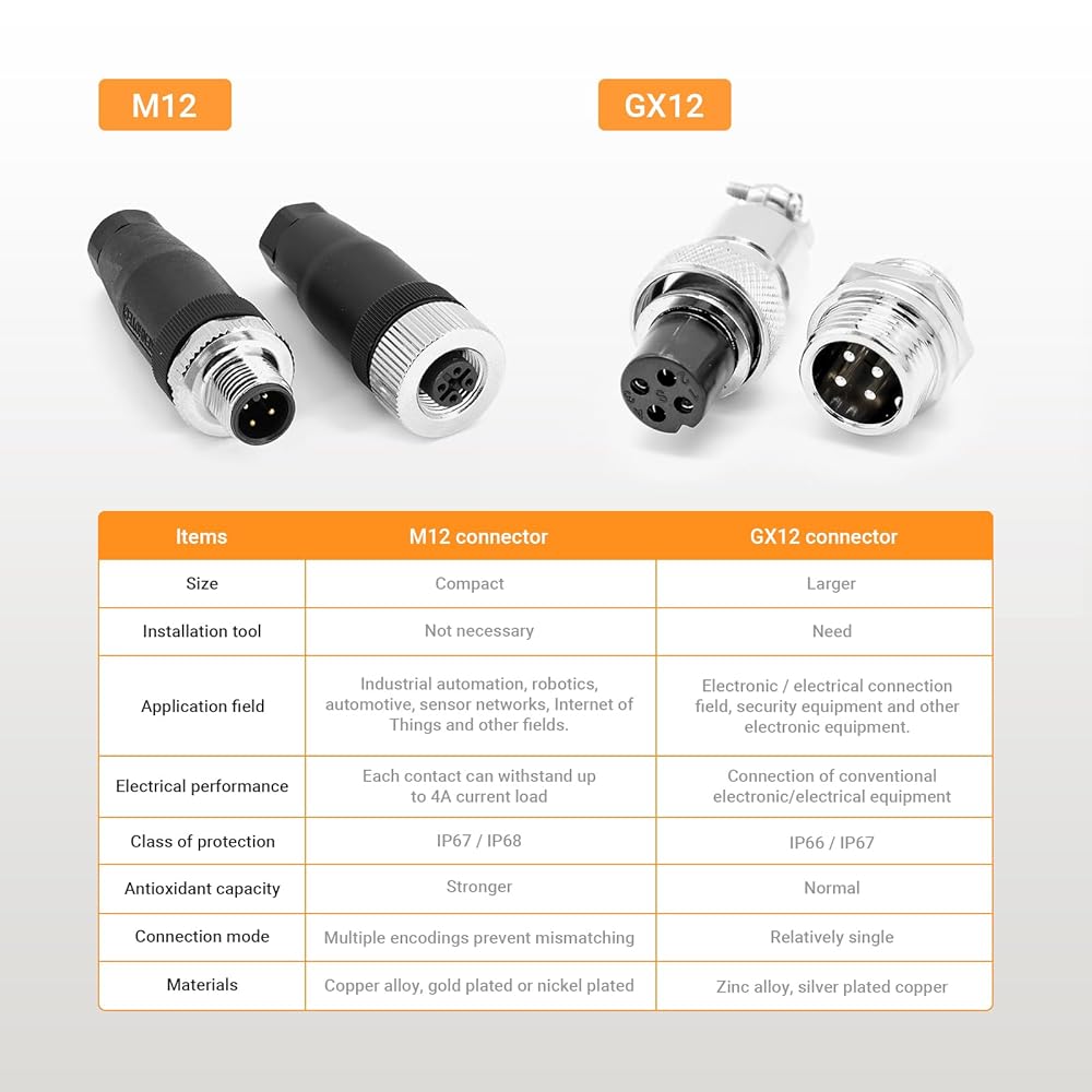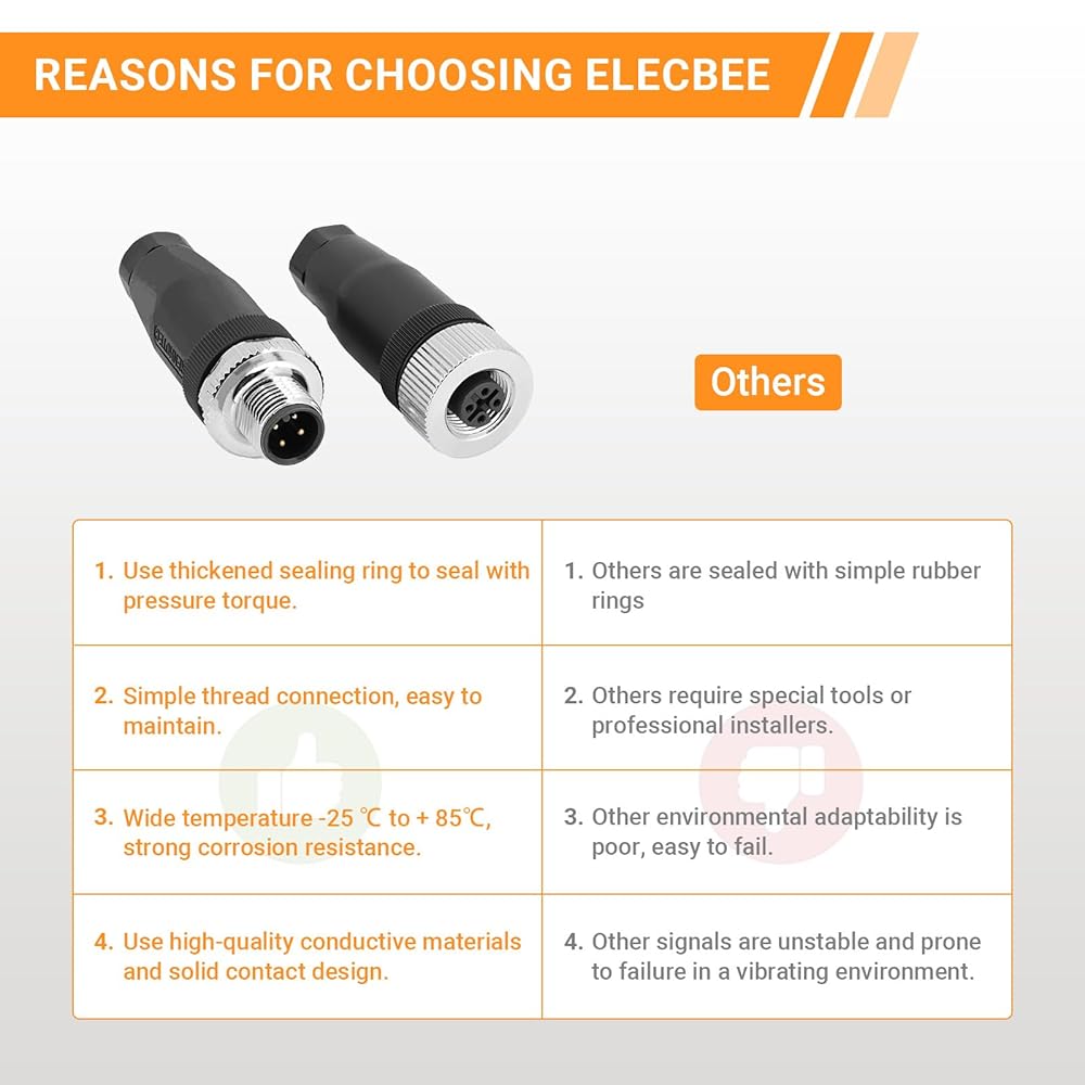 Water and Shock Resistant : Elecbee M12 connector features a metal housing for excellent water and shock resistance. Its metal housing is sealed to prevent moisture and vibration and to protect the stability of electrical connections.