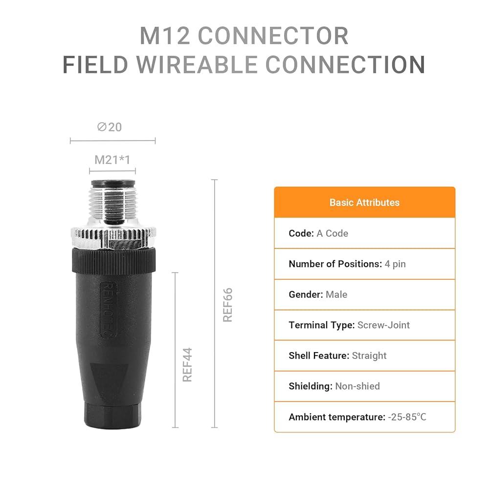 The M12 4Pin Male ACode connector can be used for the wiring PG9 which is mainly used for aerospace various instruments and control units and field bus components.