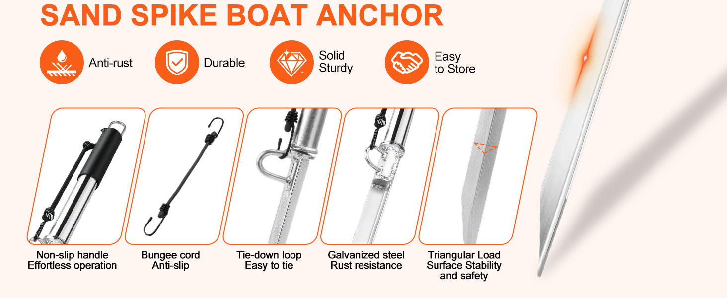 【فولاذ كربوني ممتاز】مصنوع من الفولاذ الكربوني الفاخر مع مقابض مطاطية معززة مضادة للانزلاق، يضمن مرساة رمل القارب عالي التحمل هذا تثبيتًا آمنًا ومريحًا للطوافات والقوارب حتى 36 قدمًا في المياه الضحلة وقضبان الرمل وظروف الشاطئ.