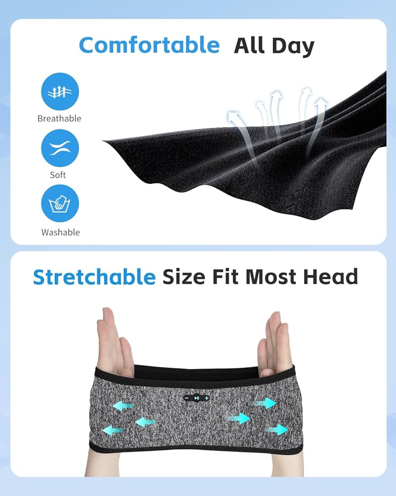 عصابة رأس للنوم بلوتوث 3 في 1: تجمع عصابة رأس النوم بلوتوث 6.0 من Veeniistor بين عصابة الرأس وسماعات الرأس وسماعات الرأس للنوم في تصميم واحد. مصنوع من مزيج القطن والبوليستر الناعم وجيد التهوية، وهو ملائم بشكل مريح ومناسب للنوم أو القيلولة أو السفر أو الجري أو اليوغا أو الاسترخاء في المنزل.