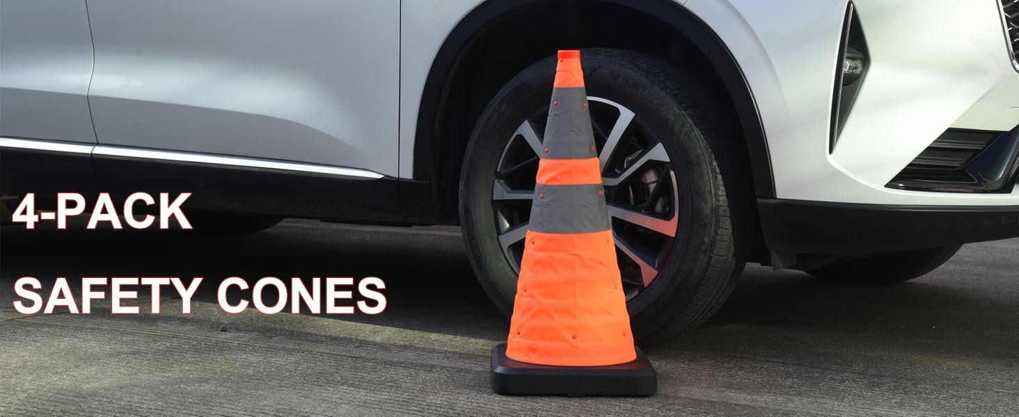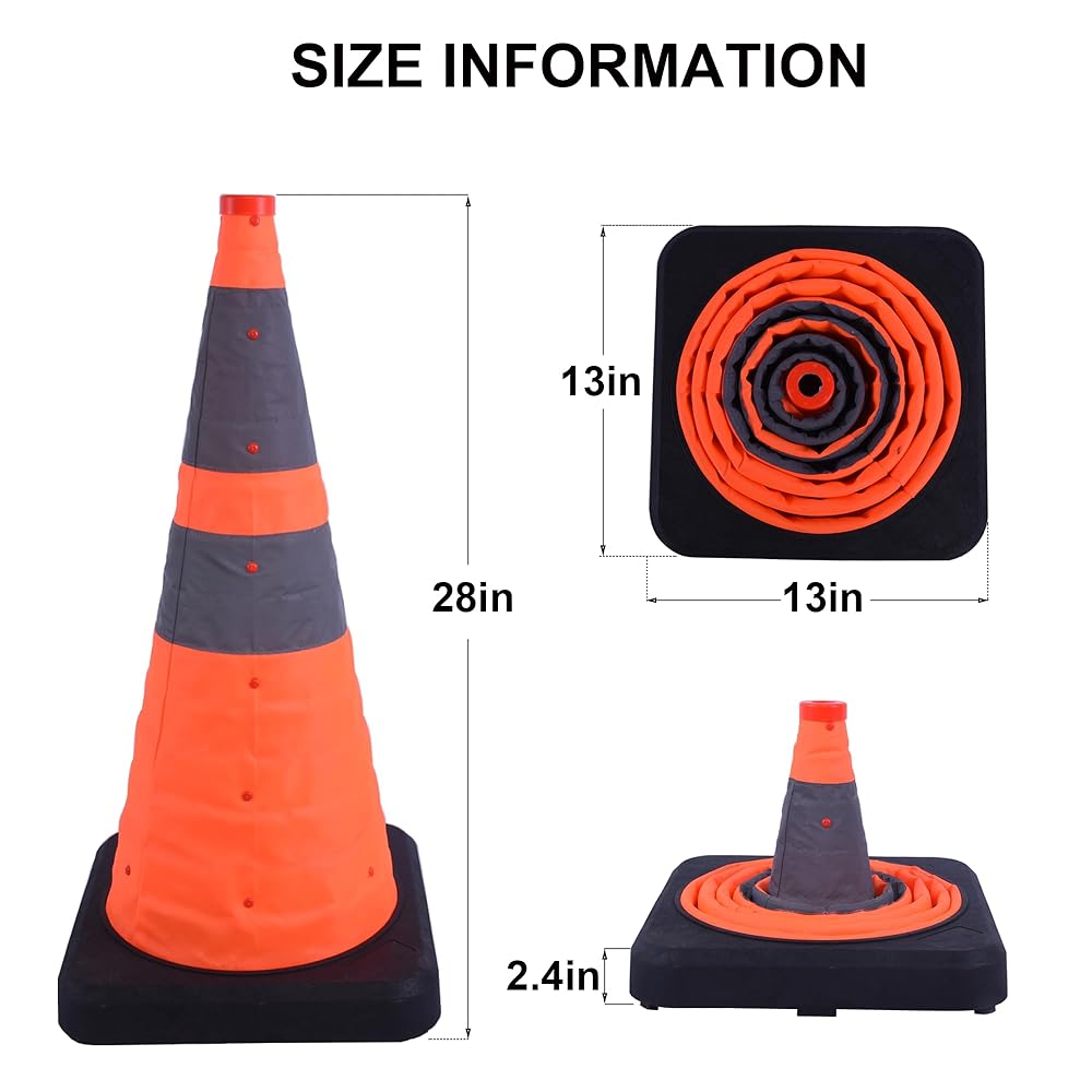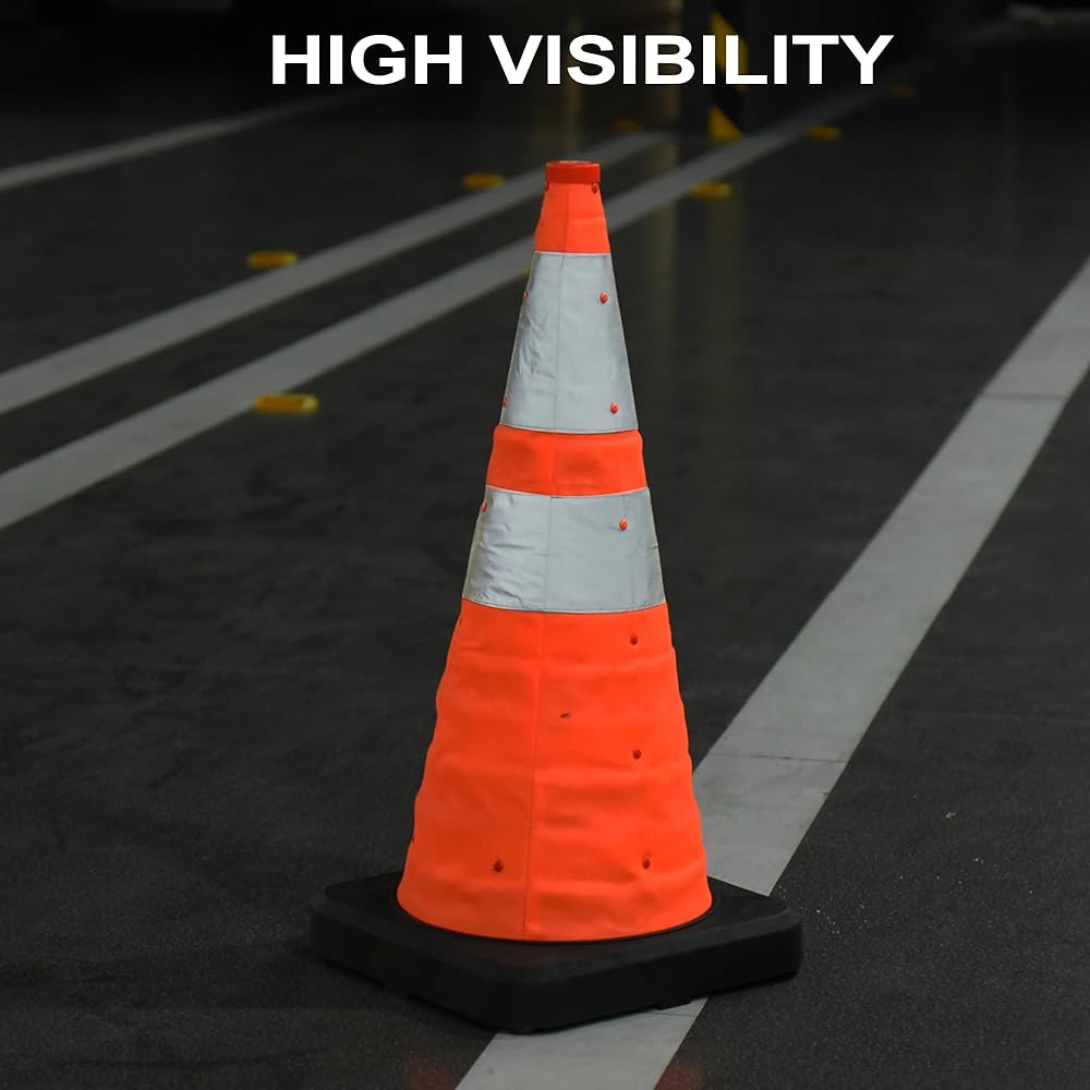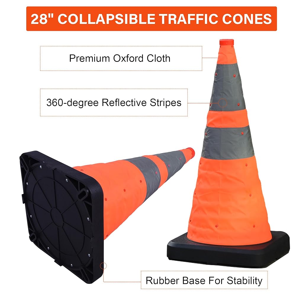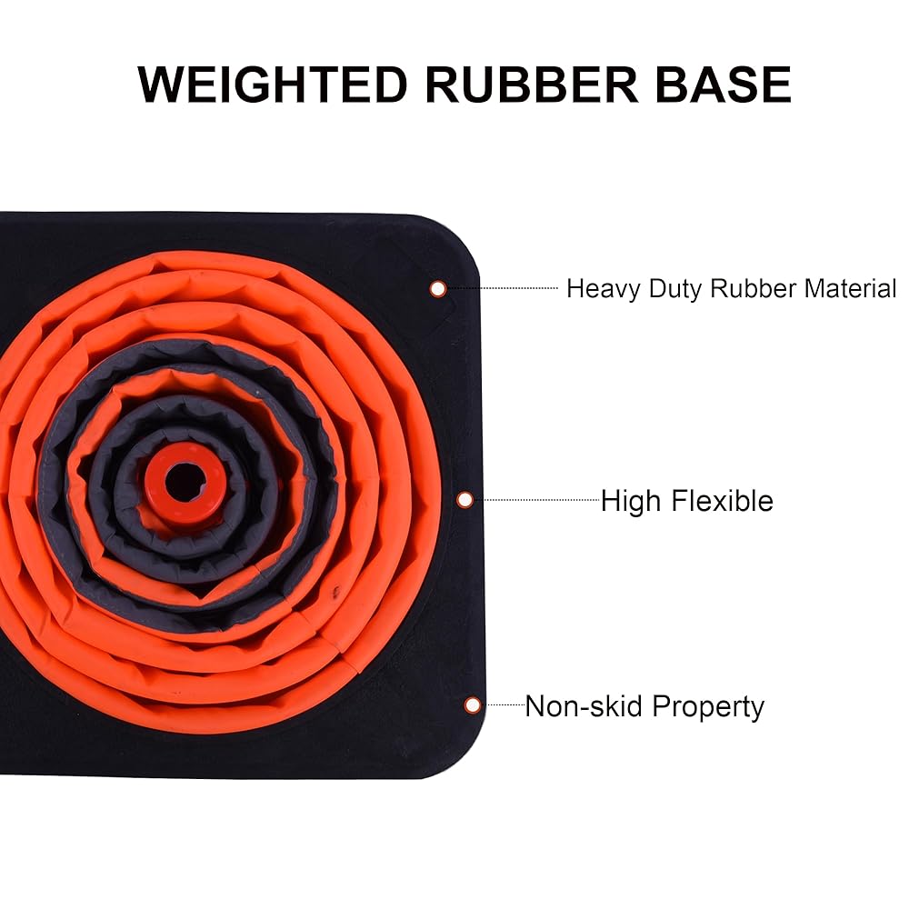 مواد عالية الجودة: مخاريطنا البرتقالية مقاس 28 بوصة مصنوعة من قماش أكسفورد ومجهزة بقاعدة مطاطية قوية، مما يضمن أنها تتحمل الظروف الجوية المختلفة.