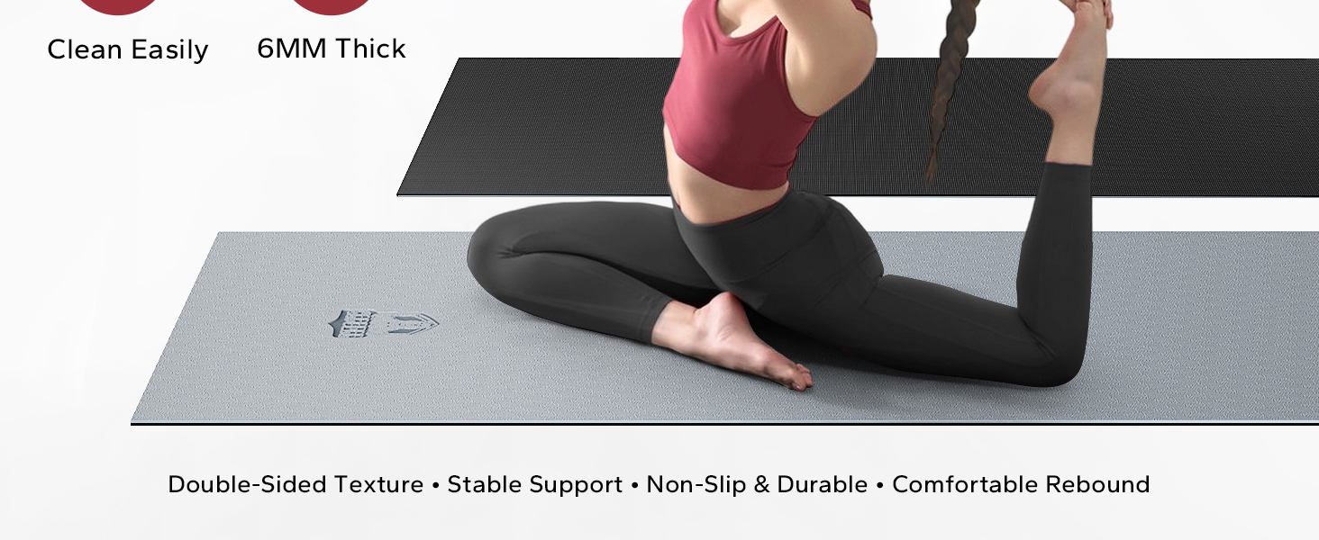 سجادة اليوجا السميكة 6 مم لتبطين فائق: بسمك 6 مم، توفر سجادة اليوجا السميكة الخاصة بنا توسيدًا ممتازًا وارتدادًا ممتازًا. يمتص الصدمات بشكل فعال، ويحمي مفاصلك أثناء التمرين. تمامًا مثل الجودة التي تتوقعها من سجادات الأرضية السميكة لليوجا، فهي توفر شعورًا فخمًا لكل حركة