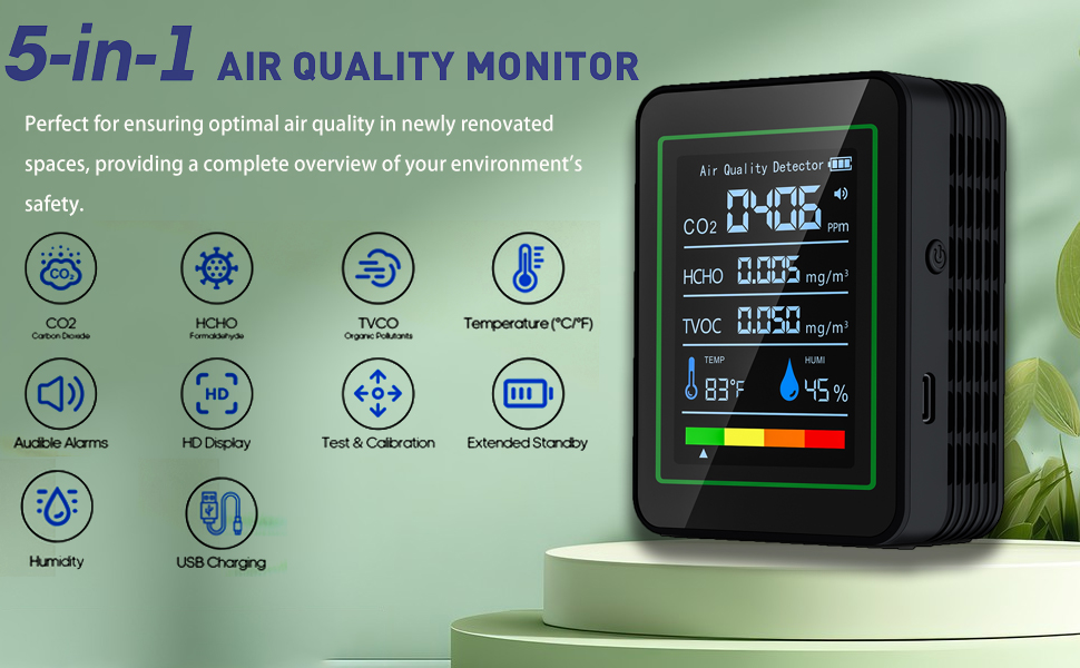 الكشف الشامل 5 في 1: يقوم جهاز مراقبة جودة الهواء هذا بمراقبة ثاني أكسيد الكربون والمركبات العضوية المتطايرة والفورمالدهيد ودرجة الحرارة والرطوبة في وقت واحد، مما يضمن جودة الهواء المثالية في المساحات التي تم تجديدها حديثًا ويوفر نظرة عامة كاملة على سلامة بيئتك.