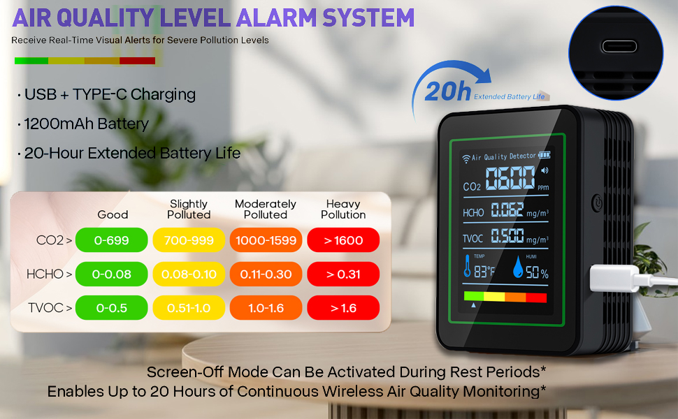 إمكانية الشحن السريع: يتم الشحن بالكامل خلال 3 ساعات فقط باستخدام كابل البيانات من النوع C المتضمن، مما يوفر 240-360 دقيقة من المراقبة المستمرة لجودة الهواء بشحنة واحدة