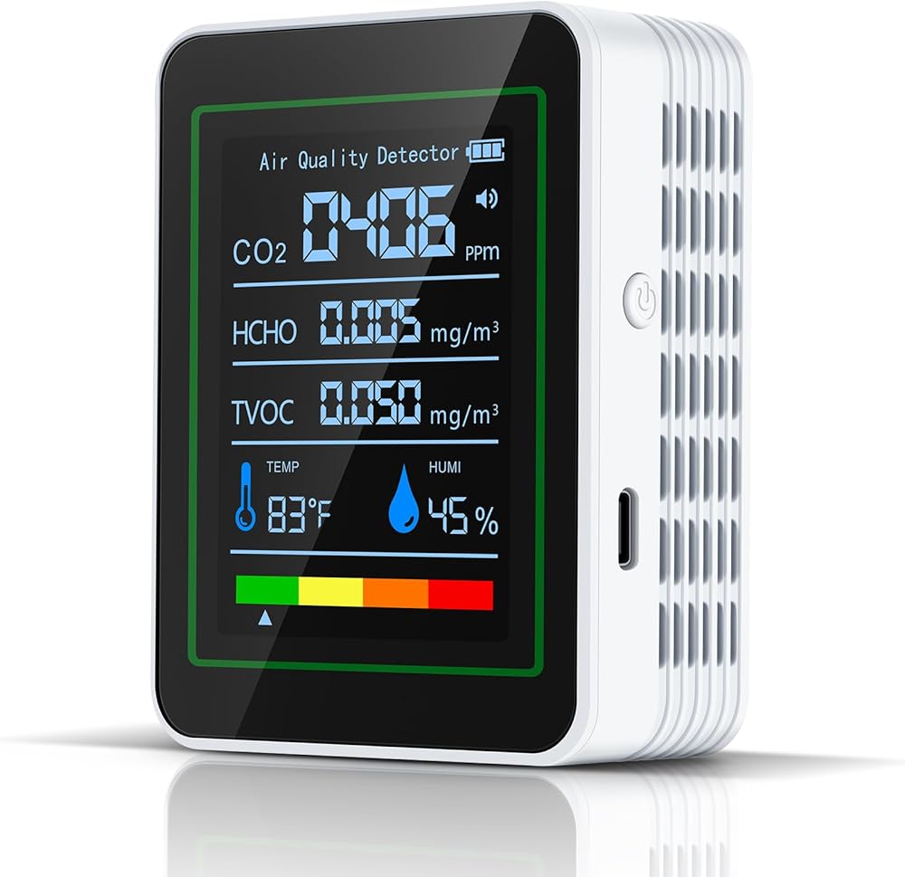 شاشة ملونة واضحة وتنبيهات فورية: تعرض شاشة LED الملونة الساطعة جميع القراءات بوضوح مع درجة جودة الهواء الشاملة وتغير اللون (مثل الأصفر أو الأحمر) إذا أصبحت المستويات غير صحية، مما يمنحك تحذيرًا بصريًا فوريًا