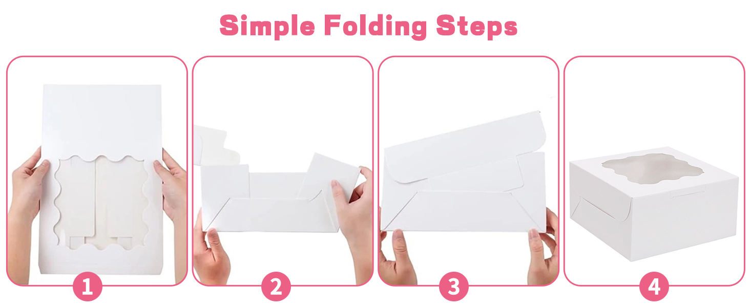 سهلة التجميع: تصل الصناديق بشكل مسطح مع خطوط مجعدة مسبقًا من أجل طيها بسرعة وسهولة في الشكل. ببساطة قم بفتحها عند الحاجة وقم بتسويتها للتخزين المدمج والموفر للمساحة عند عدم الاستخدام - مريحة بشكل لا يصدق للخبازين المنزليين والشركات على حد سواء.