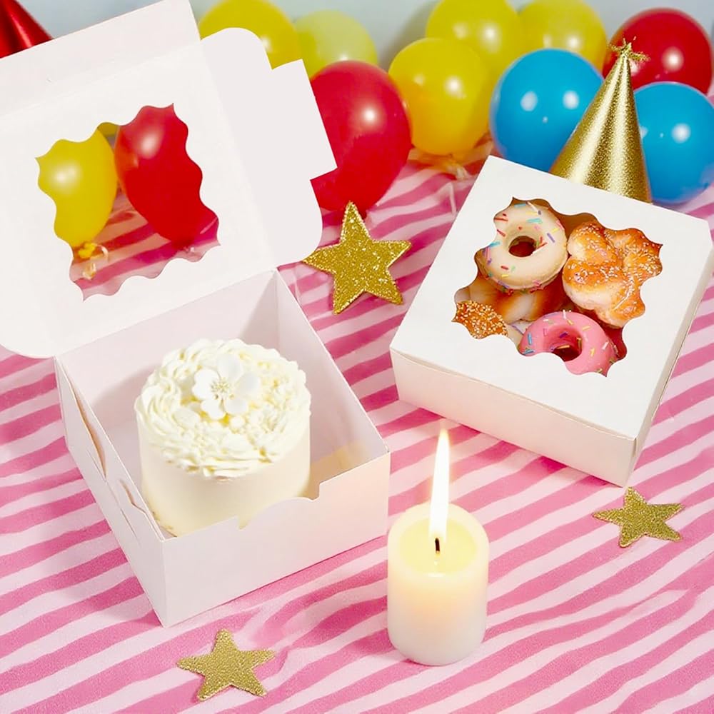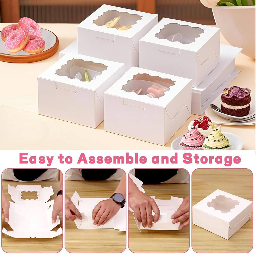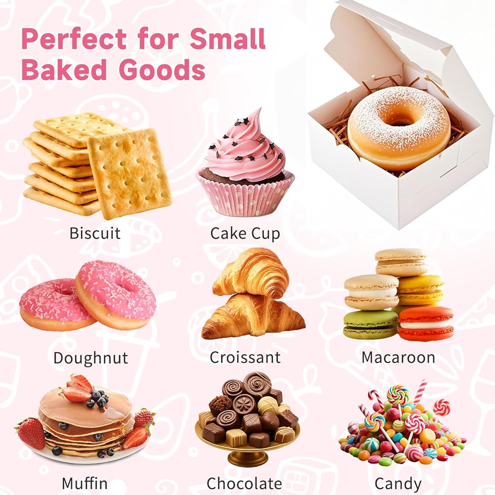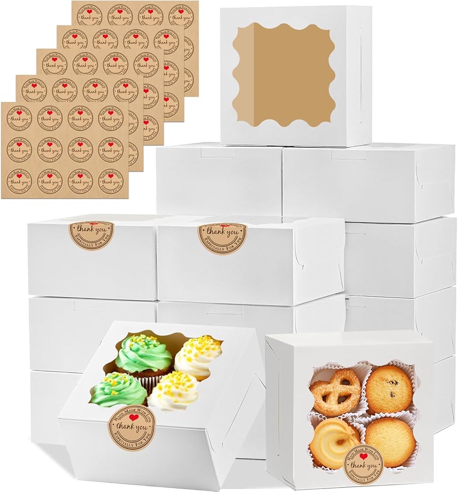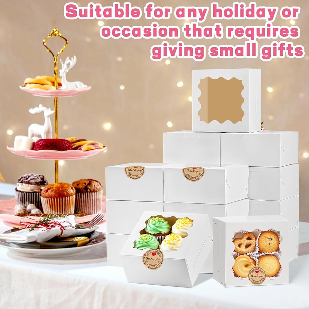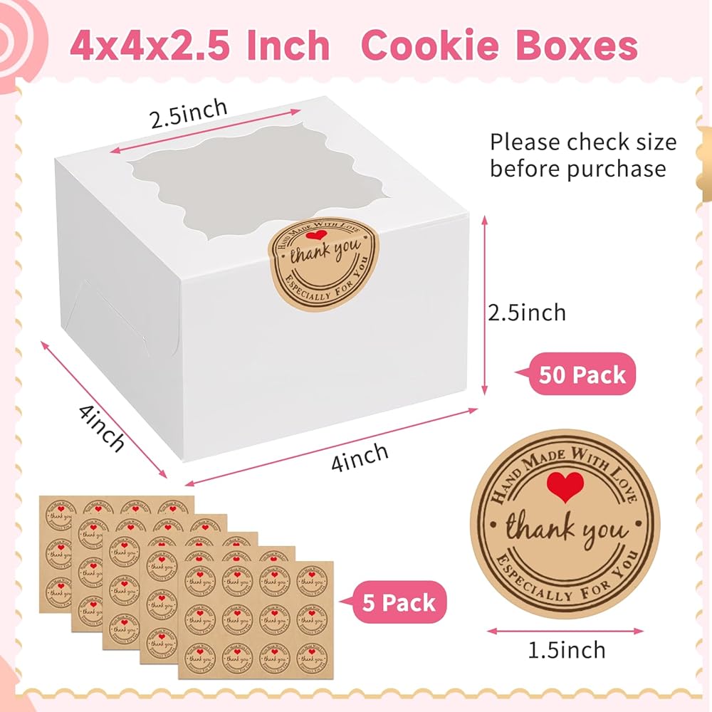 تشمل العبوة: يبلغ مقاس كل صندوق 10.16 سم × 10.16 سم × 6.35 سم وهو مناسب لمجموعة متنوعة من السلع المخبوزة. تحتوي كل عبوة على 50 صندوق خبز و60 ملصقًا مزخرفًا "شكرًا لك" مثالي للبسكويت والكعك الصغير والكب كيك والدونات والشوكولاتة والحلوى والفراولة المغطاة بالشوكولاتة