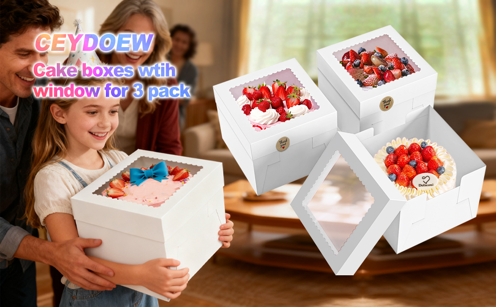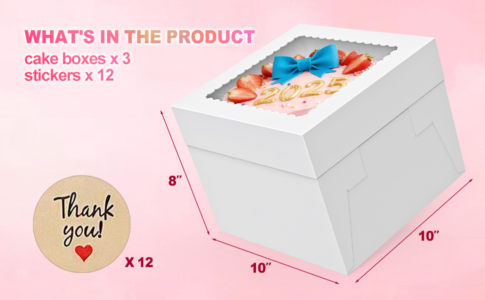 【حجم وكمية مثالية】 تحتوي هذه المجموعة على 3 صناديق كيك (10 × 10 × 8 بوصة) و12 ملصقًا "شكرًا لك". مثالية للكعك حتى 8 بوصات، ومثالية للسلع المخبوزة الصغيرة مثل البسكويت والكب كيك والفطائر. تم تصميم ارتفاع الصندوق ليناسب طبقة الكيك.