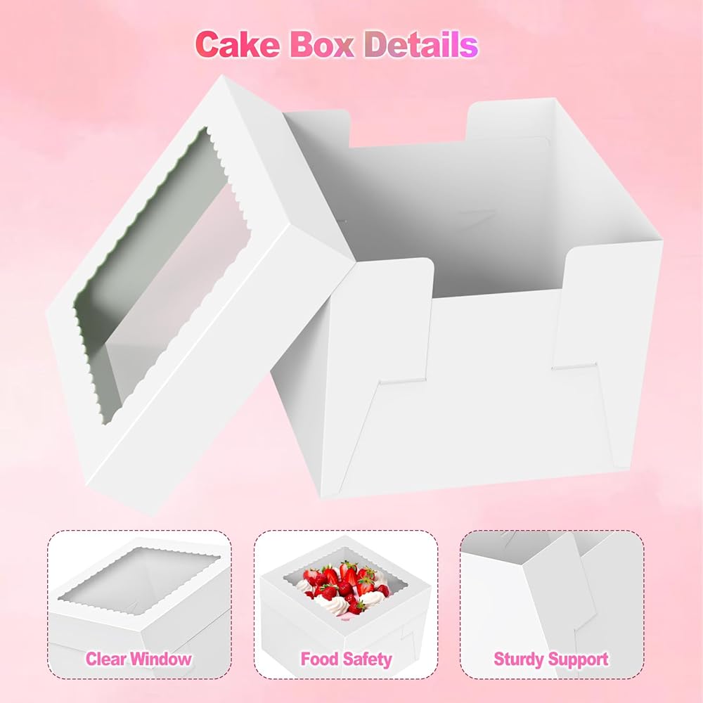 【قوية وآمنة】 مصنوعة من ورق مقوى سميك ومتين، توفر صناديق الكعك هذه حماية فائقة لديكورات الكعك الرقيقة والصقيع، مما يضمن النقل الآمن للكعك الجميل.