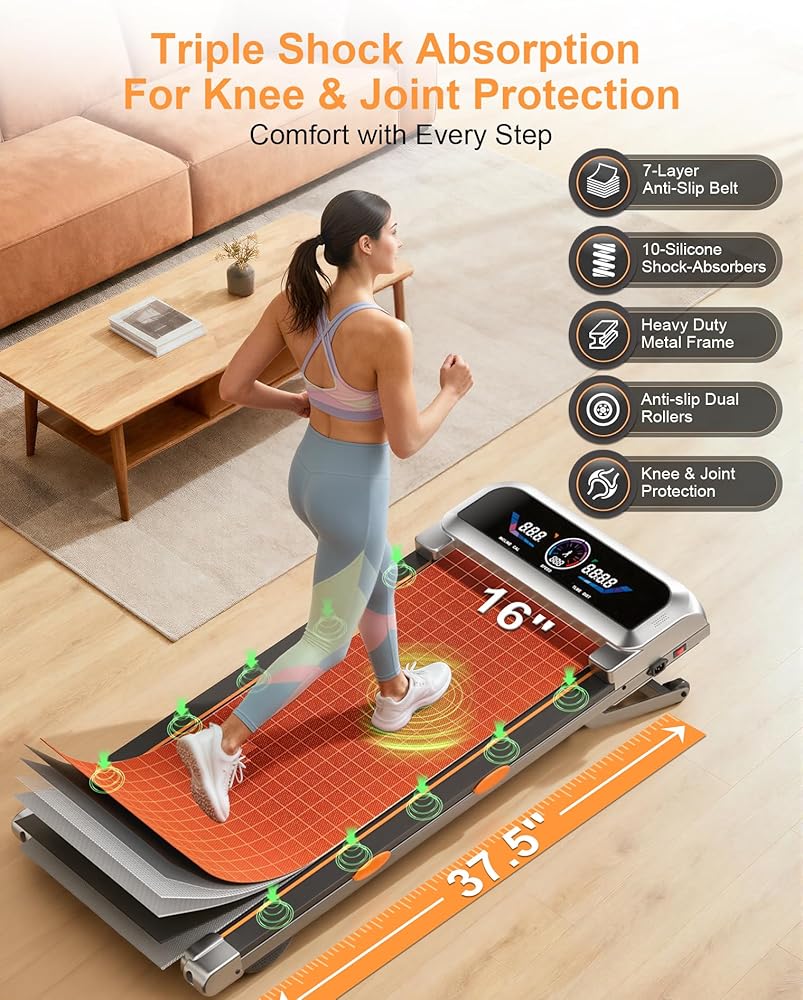 【نظام محسن لامتصاص الصدمات - راحة مريحة وحماية للمفاصل】تتميز جهاز المشي المنزلي هذا بمساحة جري كبيرة مقاس 37.5 × 16 بوصة، مما يوفر مساحة واسعة للخطوات الطبيعية. يعمل الحزام المضاد للانزلاق المكون من 7 طبقات، و10 ممتصات للصدمات من السيليكون، و4 وسائد للصدمات على تقليل التأثير بنسبة تصل إلى 40% مقارنة بأجهزة المشي القياسية. هذا التصميم الشامل يقلل بشكل كبير من الضغط على ركبتيك ومفاصلك، مما يضمن تدريبات مريحة ومحمية سواء كنت تمشي أو تركض أو تركض.