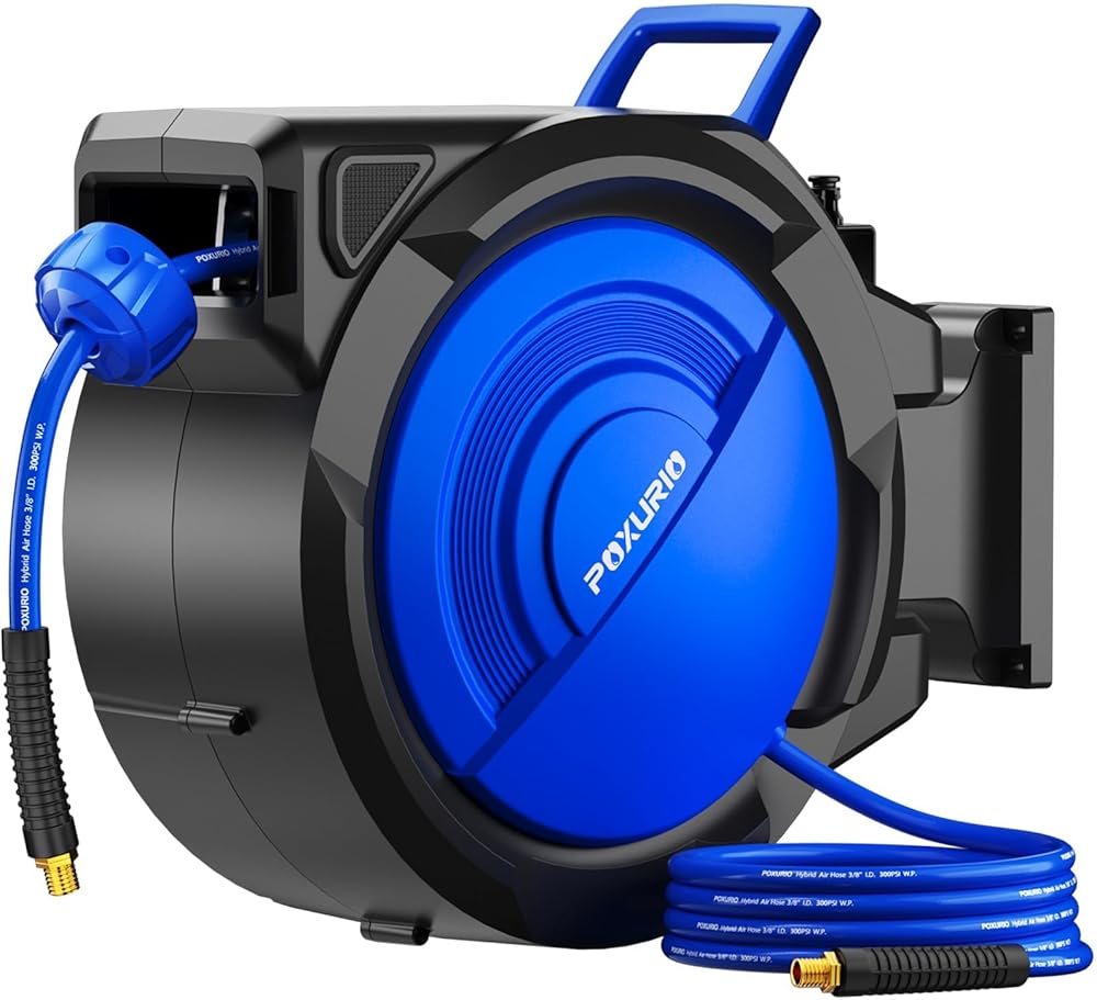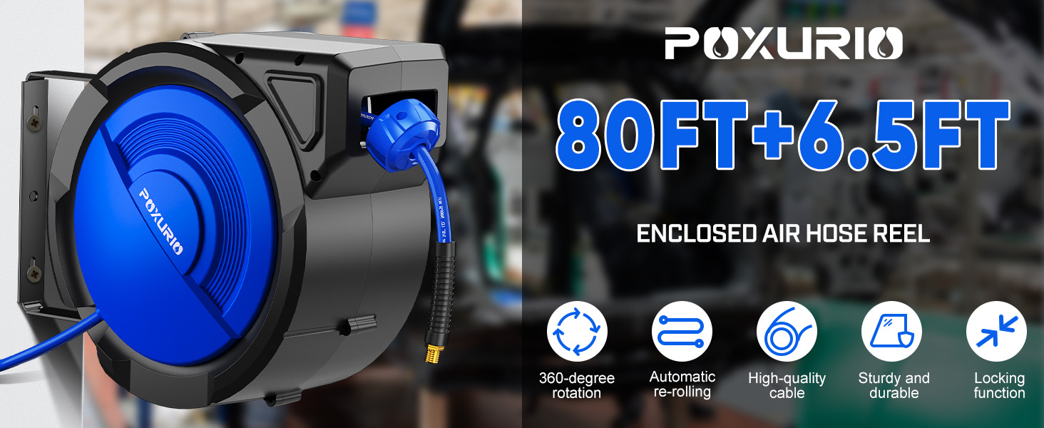 الترجيع التلقائي - بكرة خرطوم الهواء ذات اللف التلقائي من POXURIO تجعل من السهل استخدام خرطومك دون أي مكامن الخلل. ما عليك سوى سحب الخرطوم بلطف وسوف ينسحب بسلاسة. بكرة خرطوم الهواء المضغوط أيضًا عبارة عن بكرات غير قابلة للتمزق تقلل من تآكل الخرطوم والتآكل. يمكنك ضبط السدادة لقفل الخرطوم بأي طول مرغوب. تعمل سكة توجيه البكرة تلقائيًا على طبقات الخرطوم ذهابًا وإيابًا عبر البكرة، مما يضمن أن الخرطوم يلتف بسلاسة وبشكل متساوٍ في كل مرة، بدون تشابك.