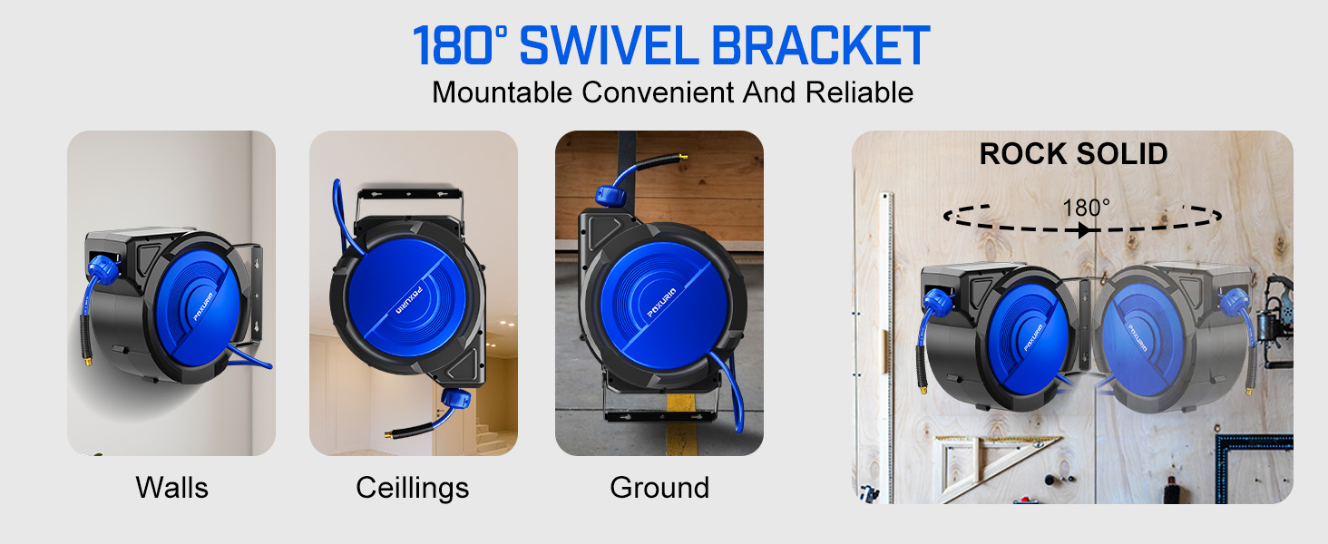 دعامة تثبيت 180 درجة - تأتي مع دعامة دوارة 180 درجة، ويمكن تركيب مجموعة بكرة خرطوم الهواء شديدة التحمل على السقف أو الجدار أو الأرض. إنها ملحقات مثالية لضاغط الهواء لورشة العمل أو المرآب أو الطابق السفلي. تدور الدعامة الدوارة 180 درجة في اتجاه العمل، مما يوفر لك تجربة تمدد مريحة ومجموعة أكثر شمولاً من الاستخدامات.